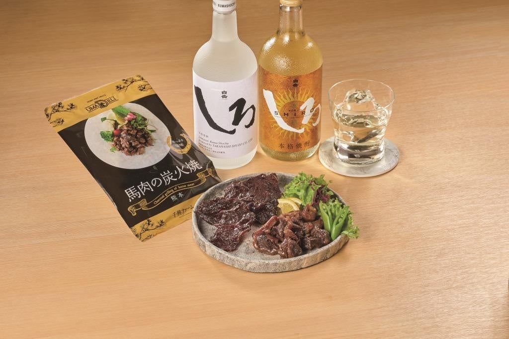 どんな料理とも相性が良い定番の「しろ」と3種の樽で熟成させた芳醇な香りとまろやかなで厚みのある口当たりが特徴の「金しろ」の飲み比べのセット。馬肉の炭火焼きとジャーキーをセットした熊本名物の詰合せです。
