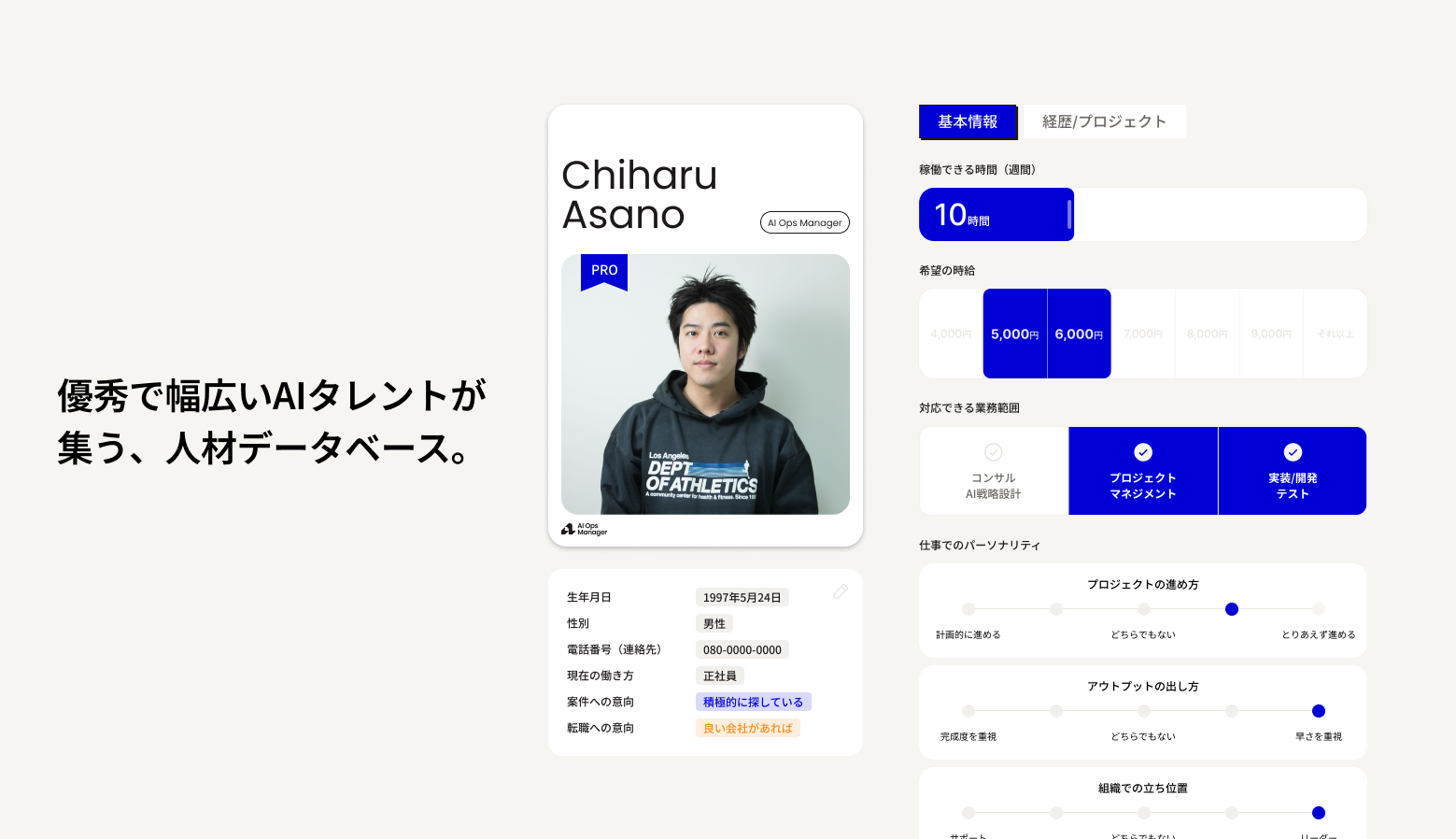 当社AI Ops Manager人材DBから即戦力の人材をプロジェクトに合わせて当社コンサルタントがご提案。ドメイン経験、開発スキル、AIスキルからマッチ度を計測、エンジニアからビジネス・PMまで幅広いロールをカバーしています。