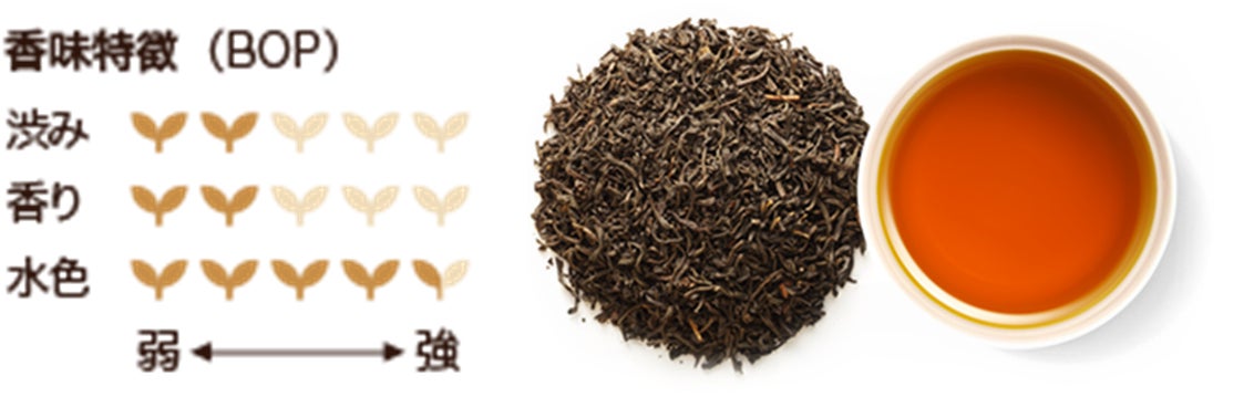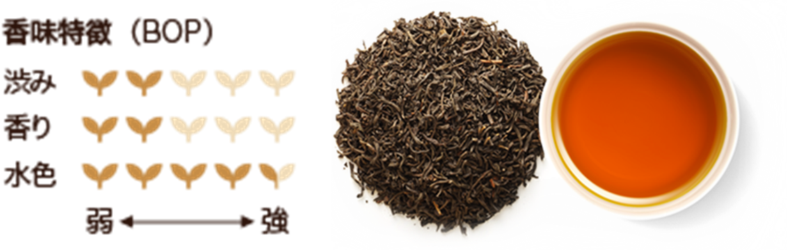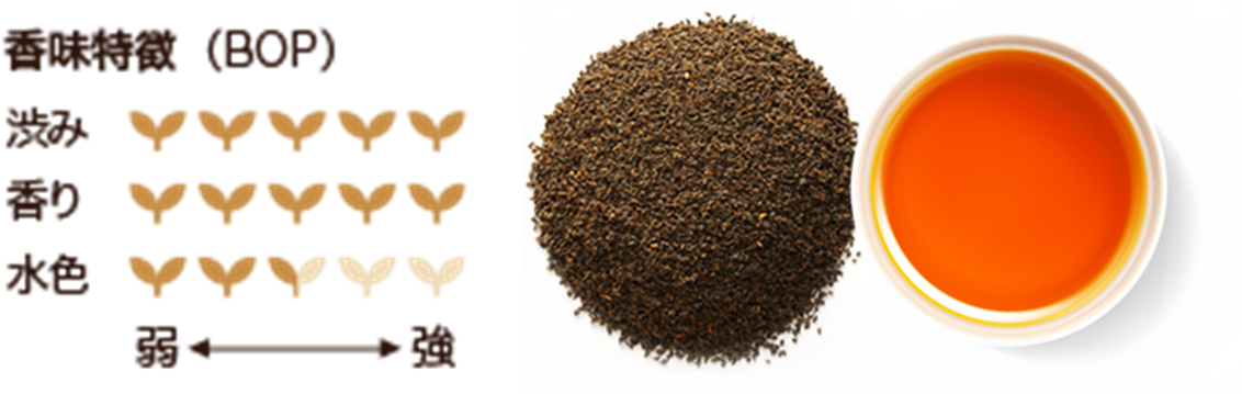 標高の低さから季節風の影響を受けにくく、気候の変化が少ない。そのため、クオリティシーズンというものはなく、一年を通してほぼ同じ性質の茶葉が収穫されるスタンダードな風味を持ち、ブレンドや、バリエーション用に最適。タンニンの量が少ないので冷やしても濁りにくく、ミルクティーやアイスティーにも向く。