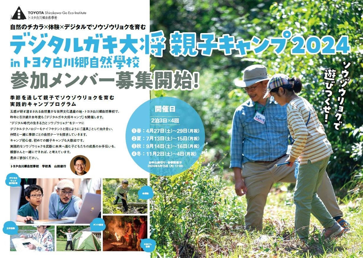 日本で最も美しい村で、“人と自然の共生と実践 ”をスローガン に トヨタ自動車株式会社と、白川郷・五箇山の合掌造り集落が世界遺産に登録されている岐阜県大野郡白川村、公益社団法人日本環境教育フォーラムなどが協力し運営している 「トヨタ白川郷自然學校」 (〒501-5620 岐阜県大野郡白川村馬狩223 學校長:山田俊行)では、2024年4月より 自然体験学習 と デジタルプログラミング体験 を 融合したカリキュラムで想像力を育み、参加者に冒険の場と機会を提供する 野外キャンプ 「デジタルガキ大将親子キャンプ2024 inトヨタ白川郷自然學校 」実施が決定。