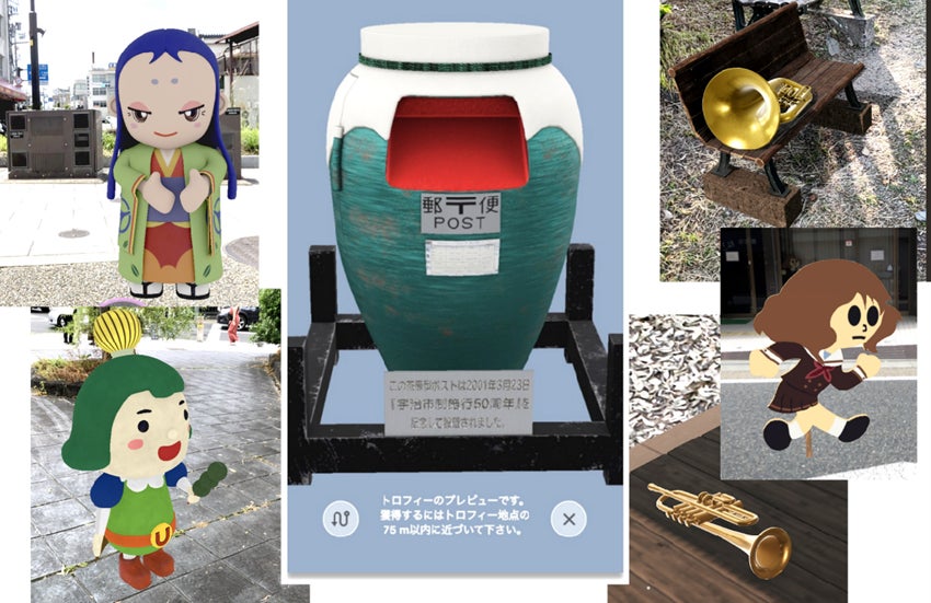 第1回⽬は、宇治橋通り商店街コレクション#01 として、「チャチャ王国のおうじちゃま」「ちはや姫」「星乃パン太郎」のキャラクター、および、商店街の注⽬アイテムを 3D データ化し、商店街の各所にトロフィーとして配置します。