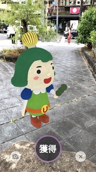4.現実の場面の中に3Dのオブジェクトが浮かび上がります。獲得ボタンを押すと、ユーザーはオブジェクトを獲得し、アプリ内のトレジャールームに保管することができます。