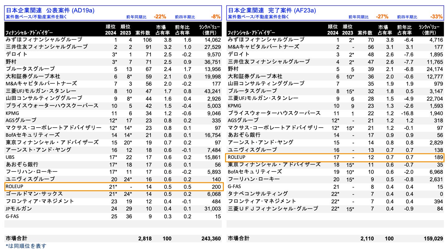 【株式会社ROLEUP】M&Aリーグテーブル(2024年3四半期)17位にランクイン!FASサービス(DD・株価算定・FA・PPA・PMI・税務)を通じて、中堅中小企業の事業承継問題の解決に貢献します