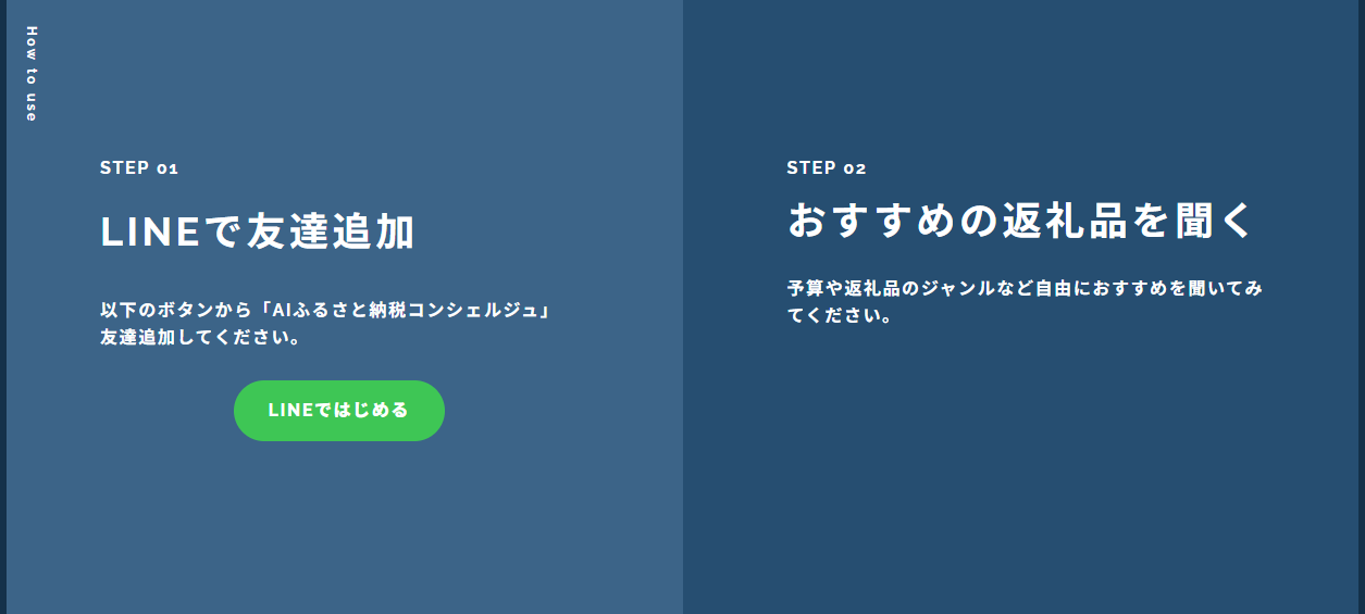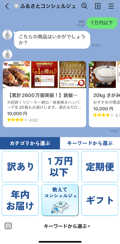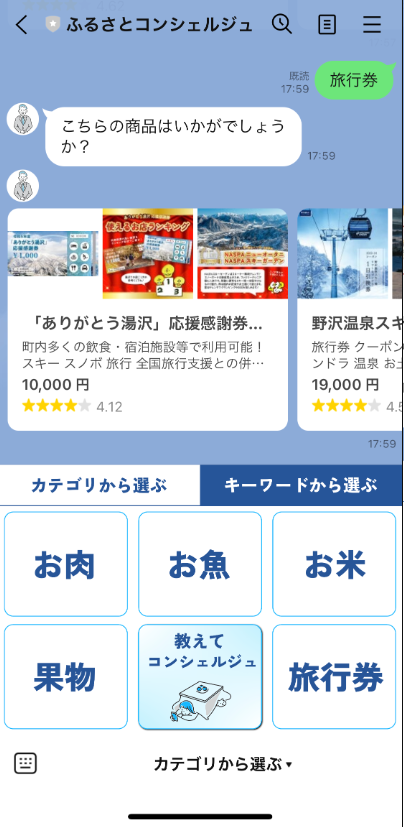 LINEで自分の好みを入力するだけで、おすすめのふるさと納税返礼品を提案
