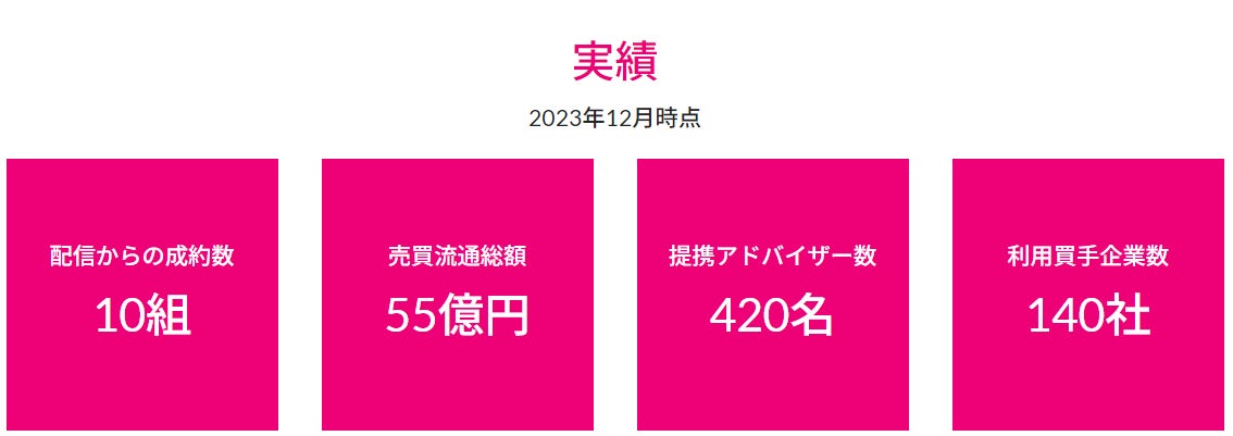 これまで、140社の企業に買収ニーズ配信サービスを利用いただき、10カ月で10組の成約を実現することに成功しました。なお、売買流通総額は55億円であり、平均成約株価は5.5億円という結果になりました。今後も様々なニーズに対応すべく、ネットワークの拡充およびサービスのブラッシュアップを行っていきます。