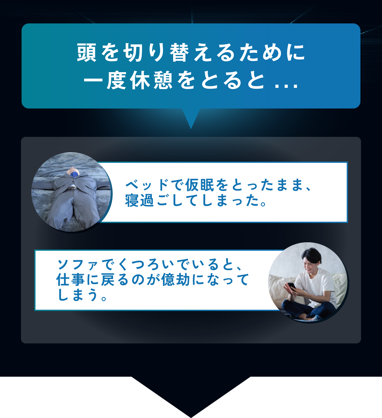 仕事に戻る時は椅子を起こすだけでONに切り替えることができるので、デスクワークの生産性を向上させることができます。