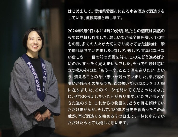 水谷酒造株式会社(所在地:愛知県愛西市、代表取締役:水谷政夫)は、2024年5月9日の火災により酒蔵が全焼したことで、創業以来180年以上にわたって受け継いできた日本酒造りの伝統が存続の危機に直面していました。このような状況の中、27歳の若き女性醸造家・後藤実和を中心に、酒蔵再建に向けたクラウドファンディングをREADYFORにて開始することとなりました。