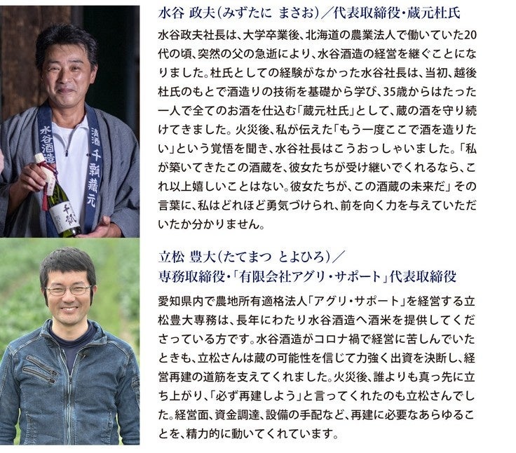 「火災後、私たちは酒造りを一度諦めかけました。しかし地域の方々、酒販店様、同業者様の温かい声援とご協力のおかげで、再び立ち上がる勇気をいただきました。このクラウドファンディングを通じて、皆様と一緒に再建への一歩を踏み出したいと願っています。ぜひ応援よろしくお願いいたします。」