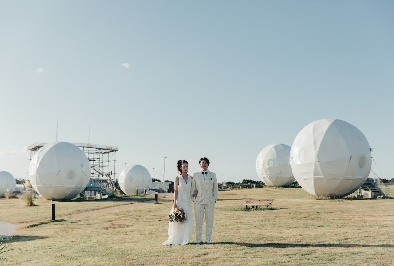泊まれる公園 INN THE PARK 福岡は、フォトウェディングと宿泊がセットになった新プランを販売します。福岡のファッションブランド「Quantize(クォンタイズ)」によるこだわりのウェディングドレスと博多湾や球体テントとともに、かけがえのない一枚を撮影いただけます。衣装やシーンにこだわりたい方、オリジナリティを追求したい方にぴったりなフォトウェディングプランです。
