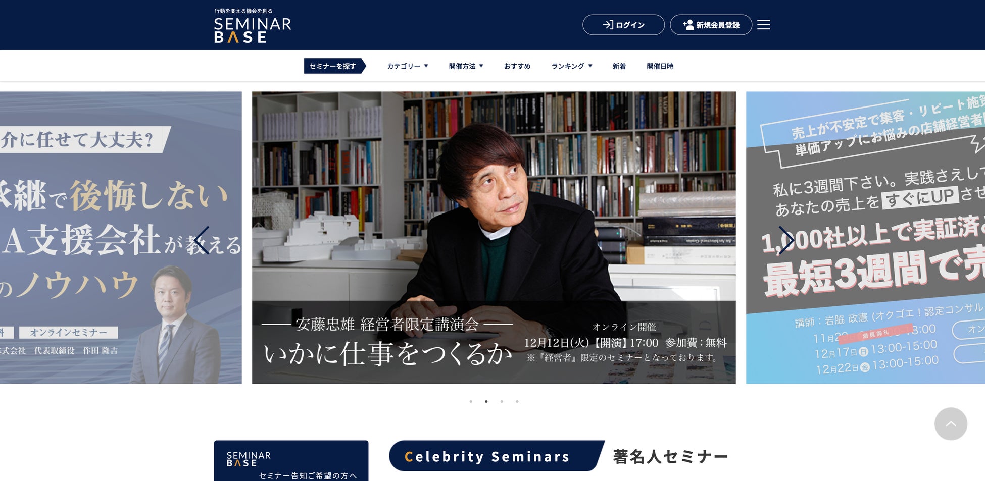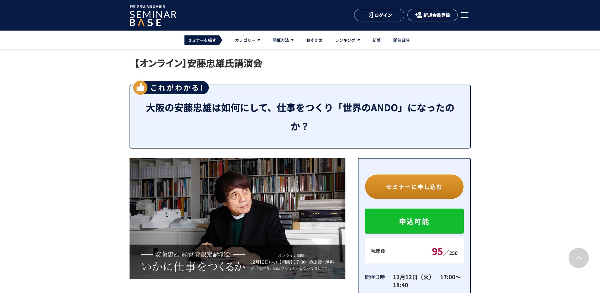 セミナー主催者と経営者やビジネスパーソンを繋げるセミナー情報ポータルサイト「セミナーベース」を2023年11月1日(水)にリリース!リリース記念「世界的建築家の安藤忠雄氏による講演会」を開催!