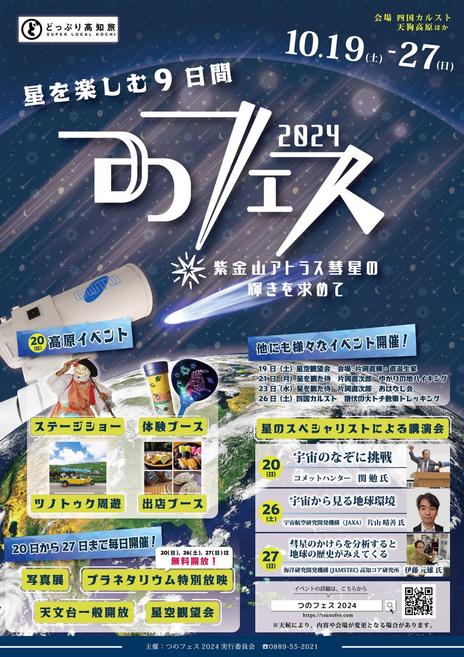 四国カルスト天狗高原、星ふるヴィレッジTENGUなどで、星を楽しむイベント「つのフェス2024~紫金山アトラス彗星の輝きを求めて~」を開催します。9日間にかけて、様々なイベントをご用意しています。