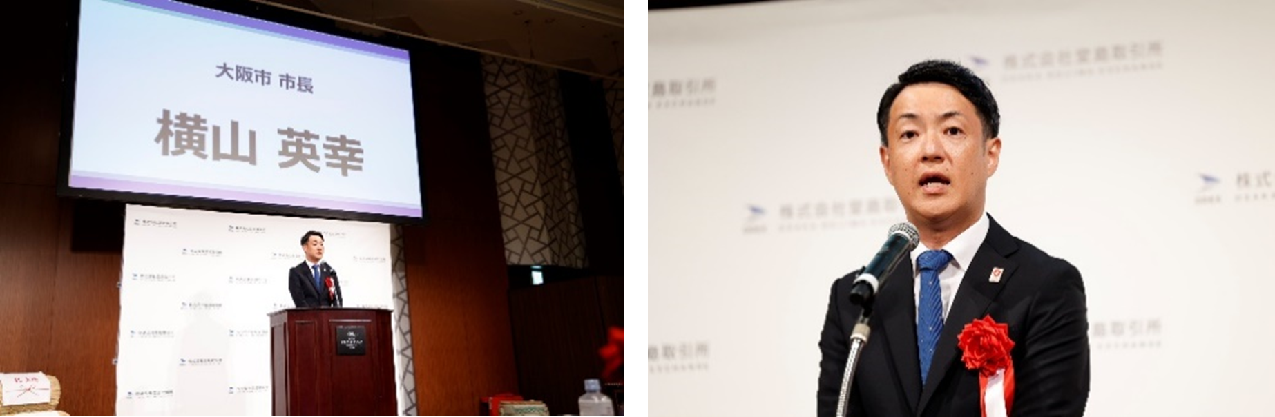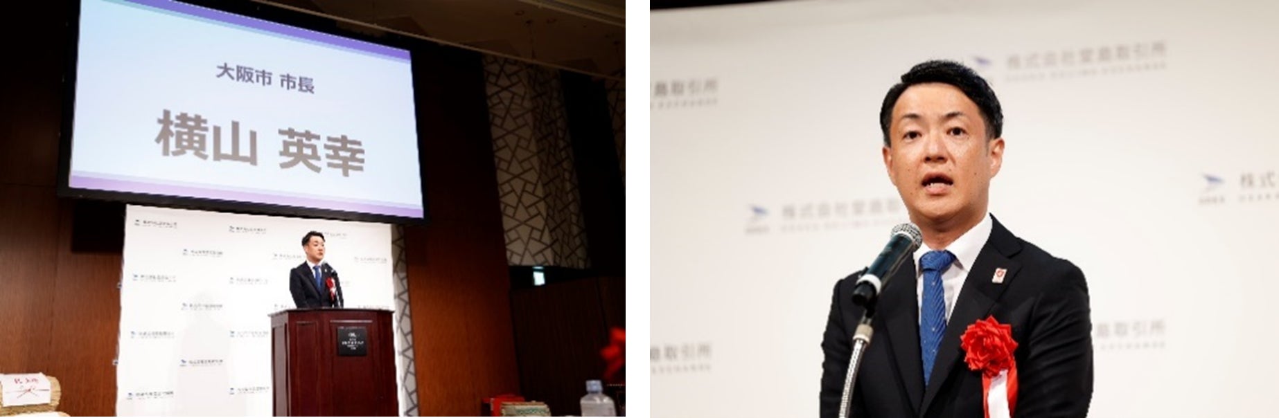 当日は、堂島取引所 代表取締役社長 有我より主催挨拶の後、国際金融都市OSAKA 推進委員会を代表して、会長の公益社団法人関西経済連合会会長の松本様、副会長の吉村大阪府知事と横山大阪市長のお二人と、委員でもあり、堂島取引所株主のSBIホールディングス株式会社代表取締役会長兼社長の北尾様より、今後に期待を寄せるご祝辞を頂きました。また、副会長の大阪商工会議所会頭鳥井様より、祝電を頂きました。