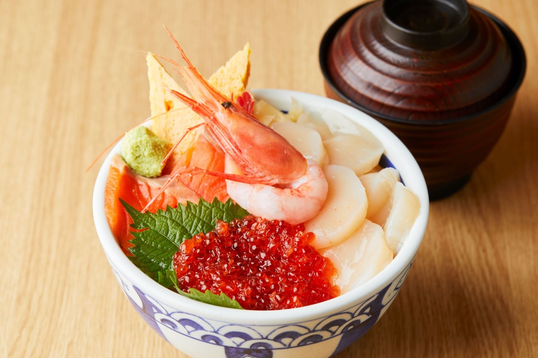 ホタテ、甘エビ、イクラ、サーモン、北の幸をふんだんに盛り付けたスペシャル丼。お味噌汁付き。