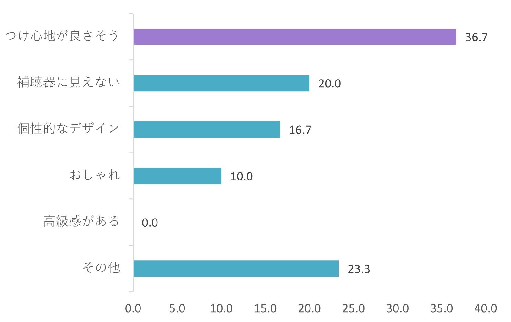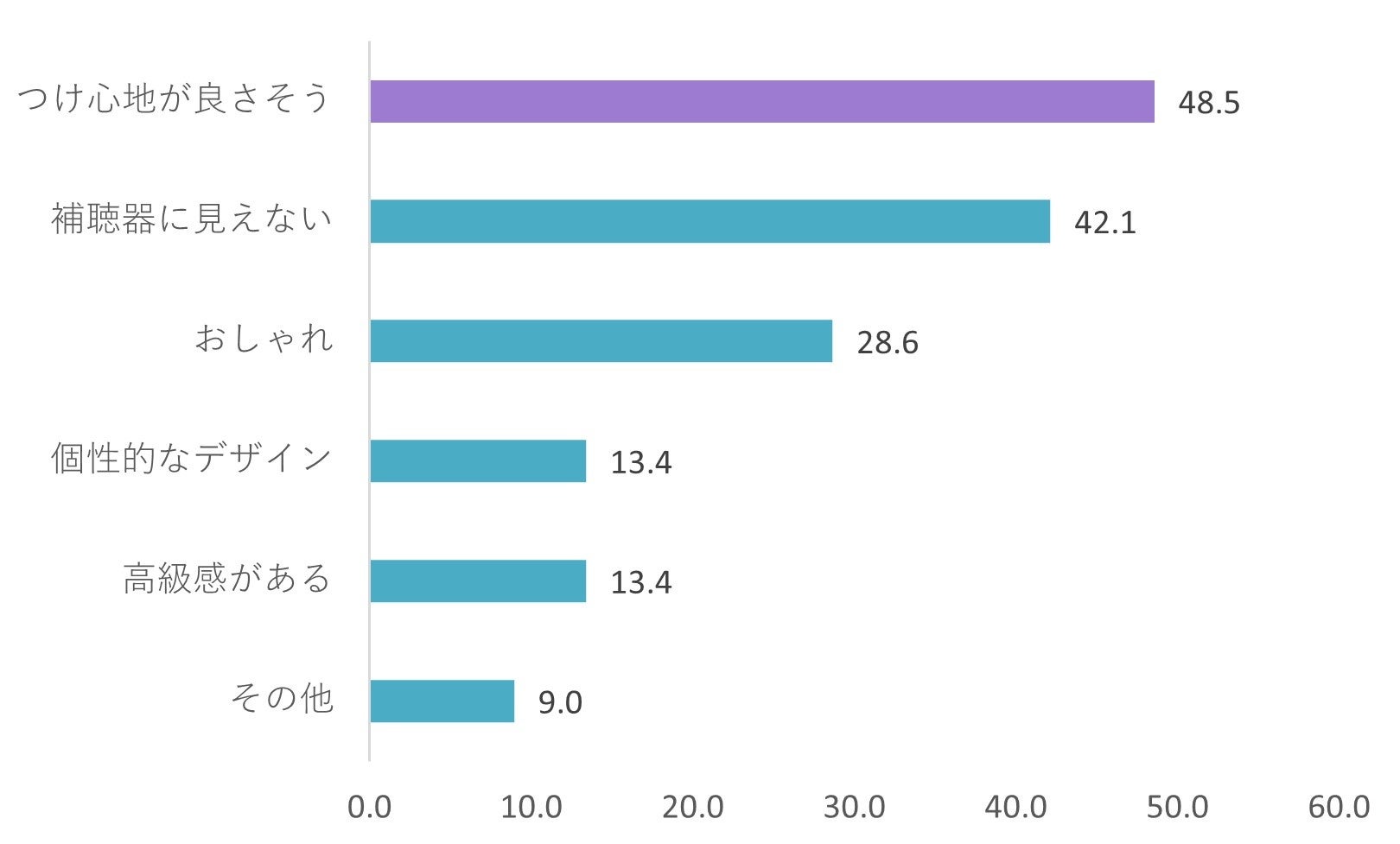 その一方で、今回の調査において新型補聴器を参考例として提示したところ、快適な装着感への期待やデザイン性に対する好意的評価が多く見受けられ、機能性に対する期待値も全体的に高い結果となりました。