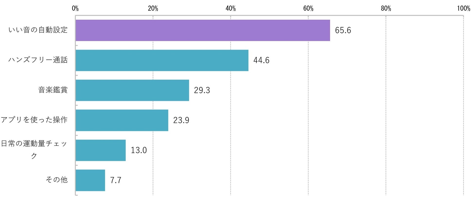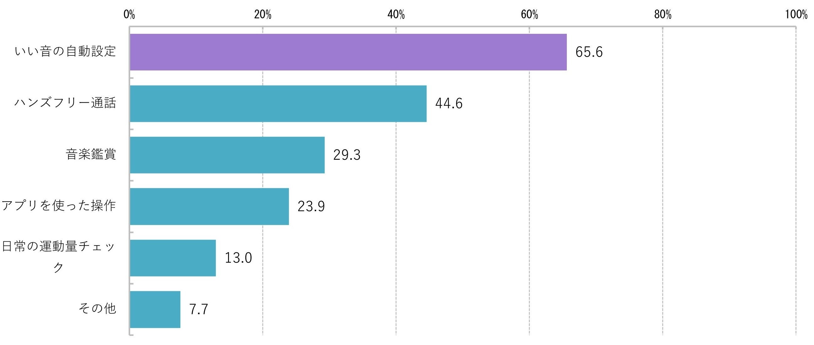 調査の前半では補聴器で聞こえが改善することに懐疑的なシニア層が少なからず存在することが判明しましたが、その一方で、「いい音の自動設定」機能を求める回答者が7割近く存在することも明らかになりました。このことから、自分好みの音や操作性の簡単さが叶えられる補聴器の場合は、シニア層に受け入れられやすいことが推測されます。さらに、「ハンズフリー通話」や「⾳楽鑑賞」にも3~4割程の方々が期待を寄せていることから、ワイヤレスイヤホンのような多様な機能性が求められている傾向も伺えます(図7)。