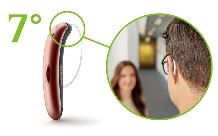 快適なつけ心地 レシーバポートにもたせた7°の角度は人間工学に基づいたオリジナル設計となっており、さらに今回特別に右耳用と左耳用が個別にデザインされています。これにより、補聴器が耳の後ろに自然にフィットするほか、メガネを使用中でも快適な着け心地が保たれます。