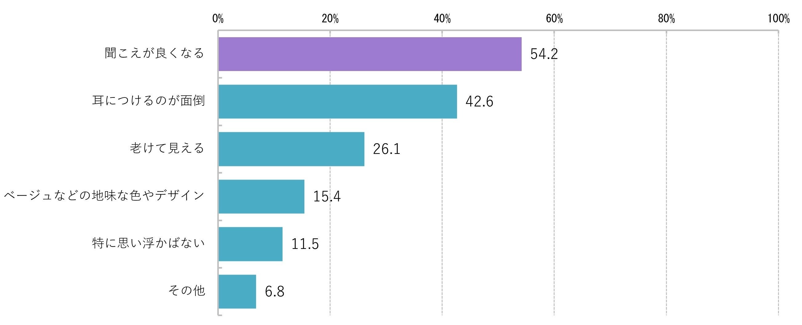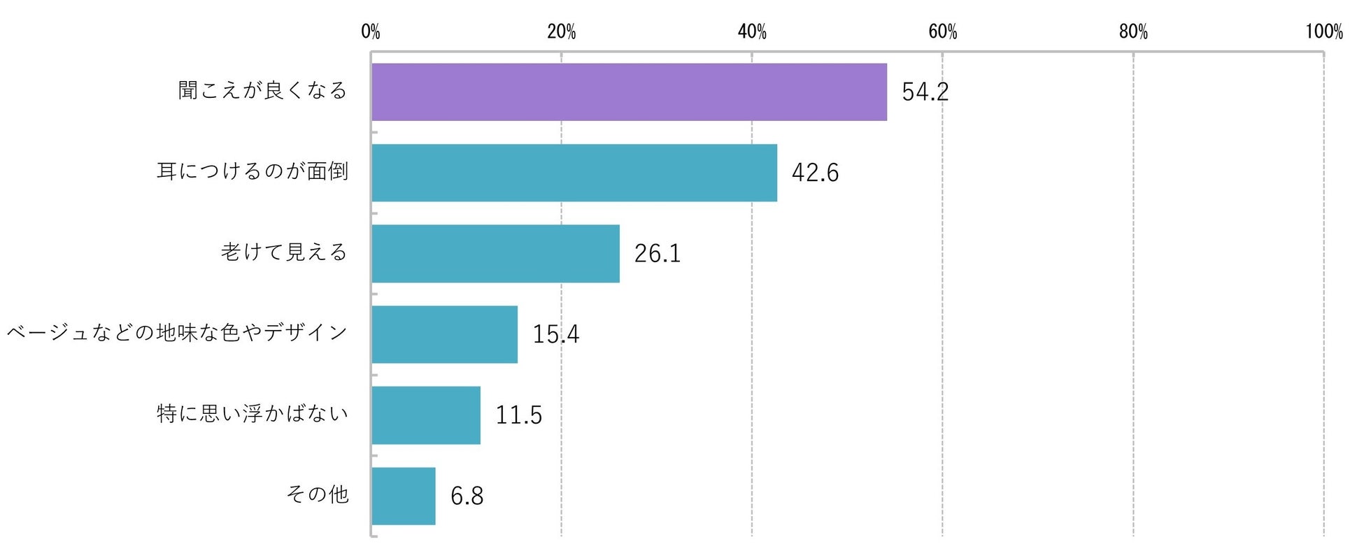 補聴器については「聞こえが良くなる」印象が全体の半数強に留まっており、補聴器としての本来の役割が十分に浸透していない様子が伺えます。さらに、「⽼けて⾒える」「地味なデザイン」等の外観的なネガティブイメージが一定数得られたほか、「耳につけるのが面倒」という使用感に関する消極的な印象が全体の半数近く挙がっており、聞こえの改善、見た目、使いやすさにおいて否定的意見が根強い傾向が見られました(図3)。