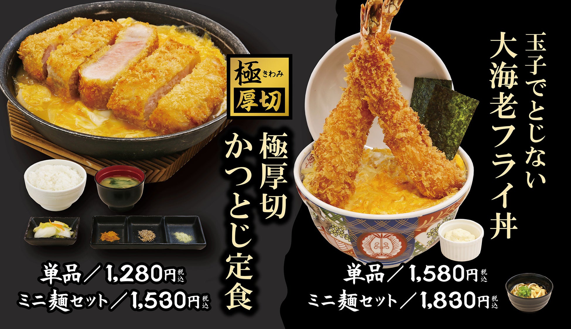 「極 厚切かつとじ定⾷」/玉子でとじない「大海老フライ丼」
