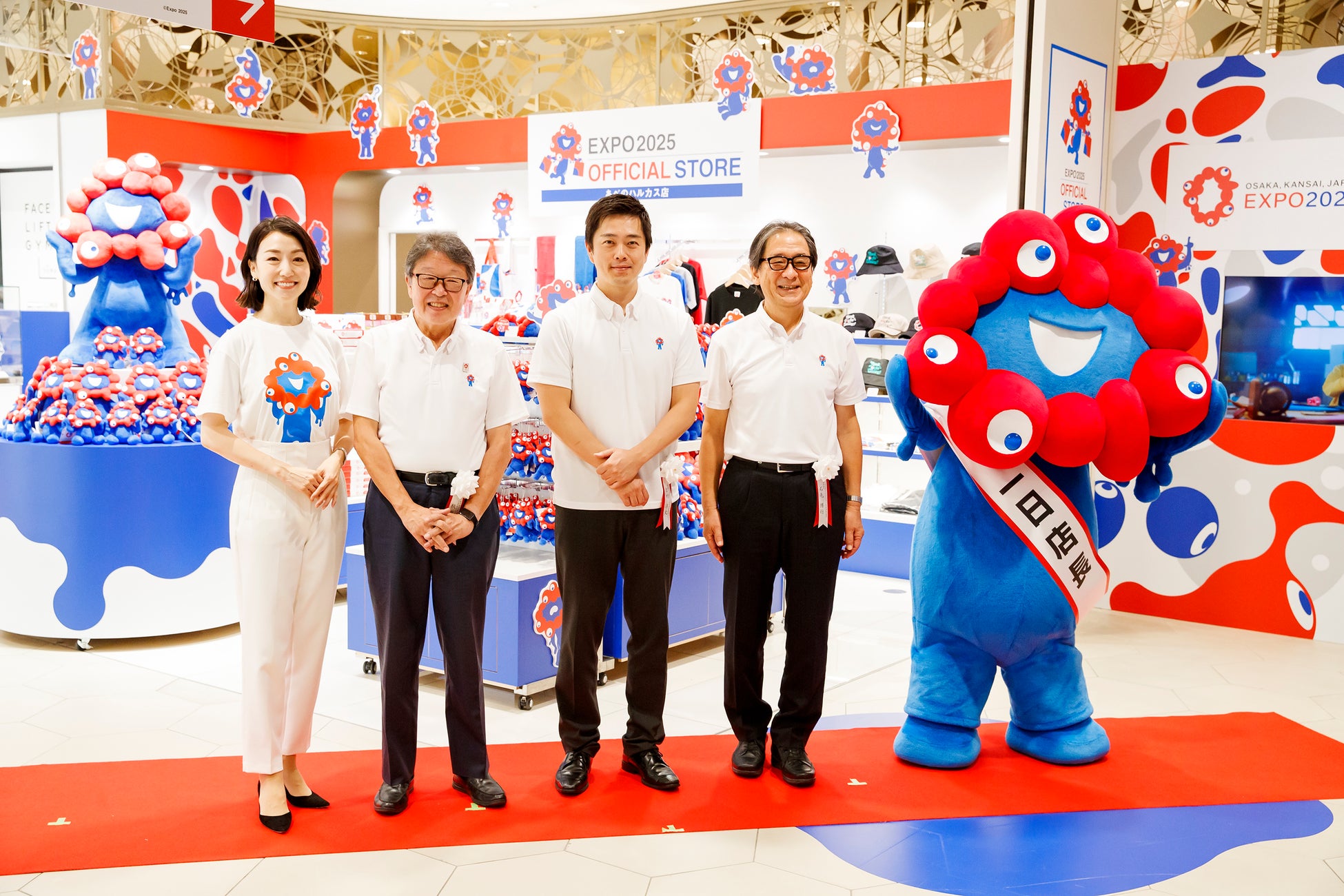オープニングセレモニーでは、当協会の石毛博行事務総長、吉村洋文副会長(大阪府知事)、近鉄百貨店の秋田拓士代表取締役社長が登壇し、オフィシャルストアの魅力や役割を紹介しました。また、1号店のオープンを記念して、公式キャラクターミャクミャクが1日店長に就任し、テープカットセレモニーに参加しました。