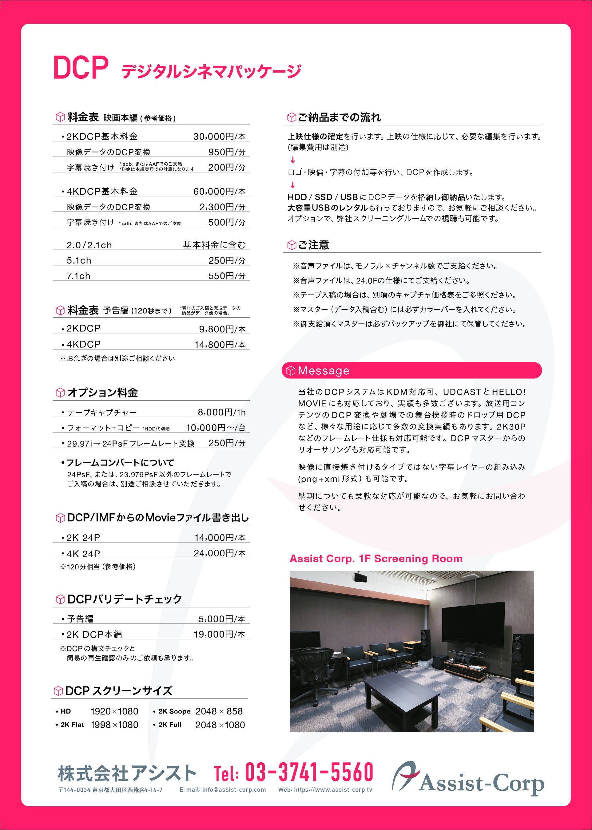 映像制作を行う株式会社アシスト(本社:東京都大田区西糀谷、代表取締役:加藤光淑)は、映像作品を映画館で上映するための「DCP(Digital Cinema Package)」制作実績が、本編および予告映像を合わせて累計3,000タイトルを突破いたしました。
