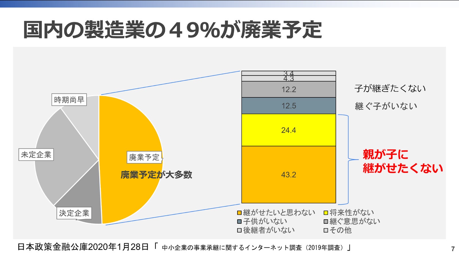 今までも町工場の事業承継には課題がありましたが、その多くは継ぐ子がいない、子供に継ぐ意思がないという後継者側の理由が主でした。しかし、今では親が子に継がせたくないという声が多数になってきました。