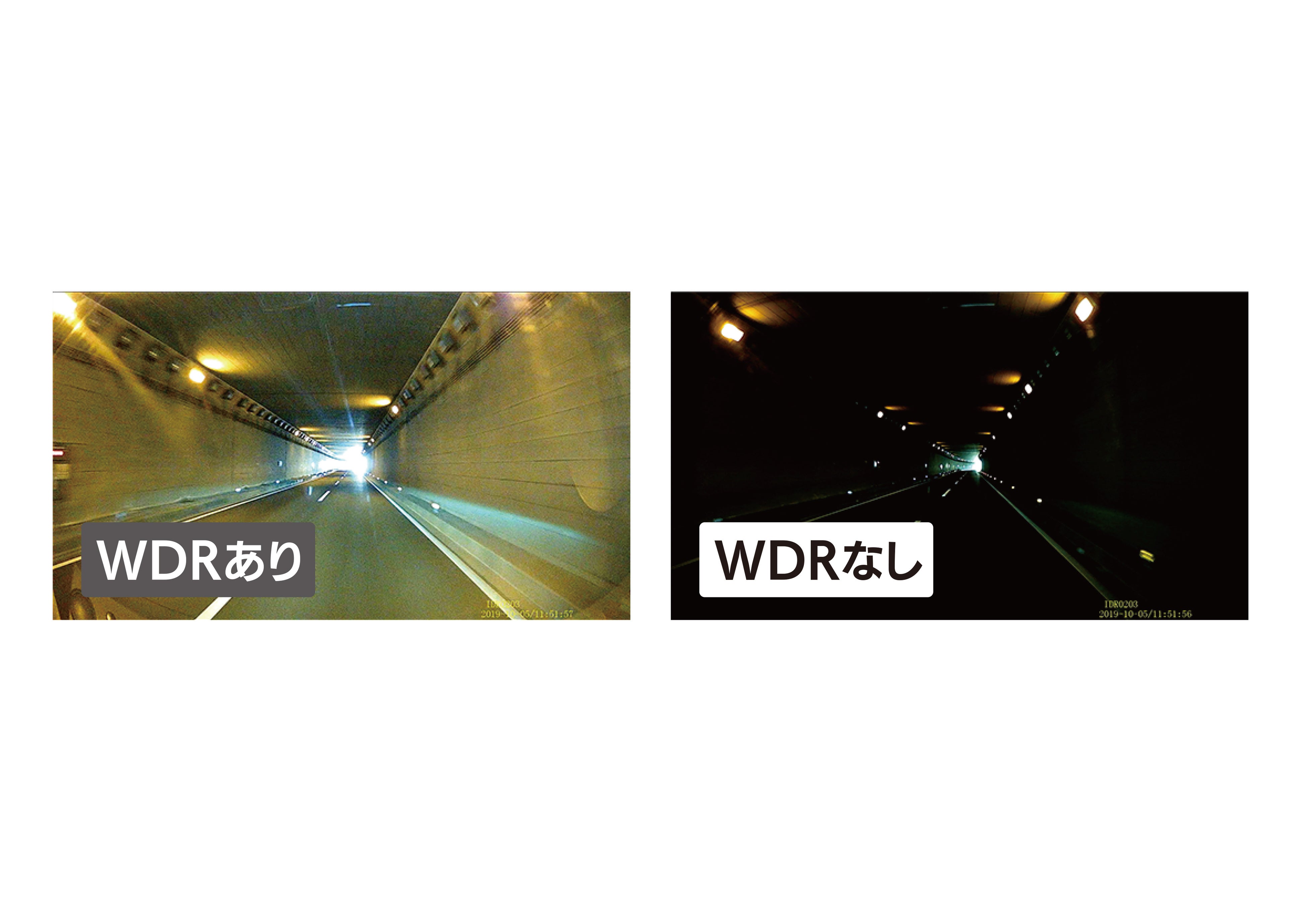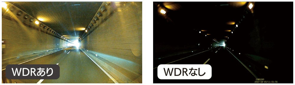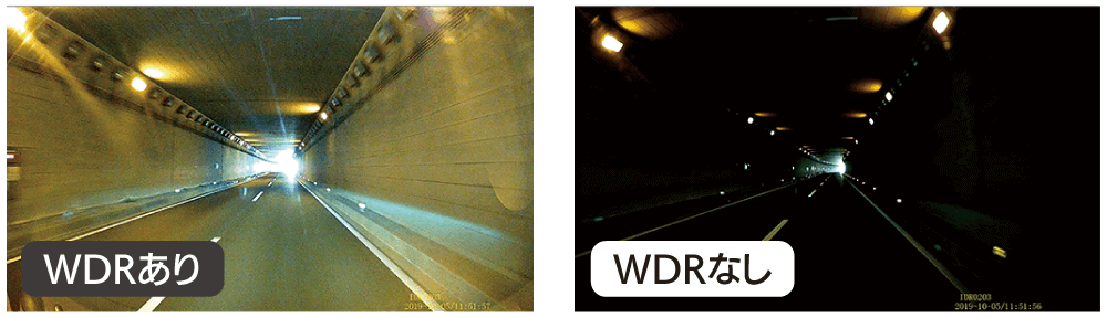 対向車のヘッドライトや逆光、トンネルなどで明暗差が大きくなる映像を補正。色飛びの少ないキレイな映像を映します。