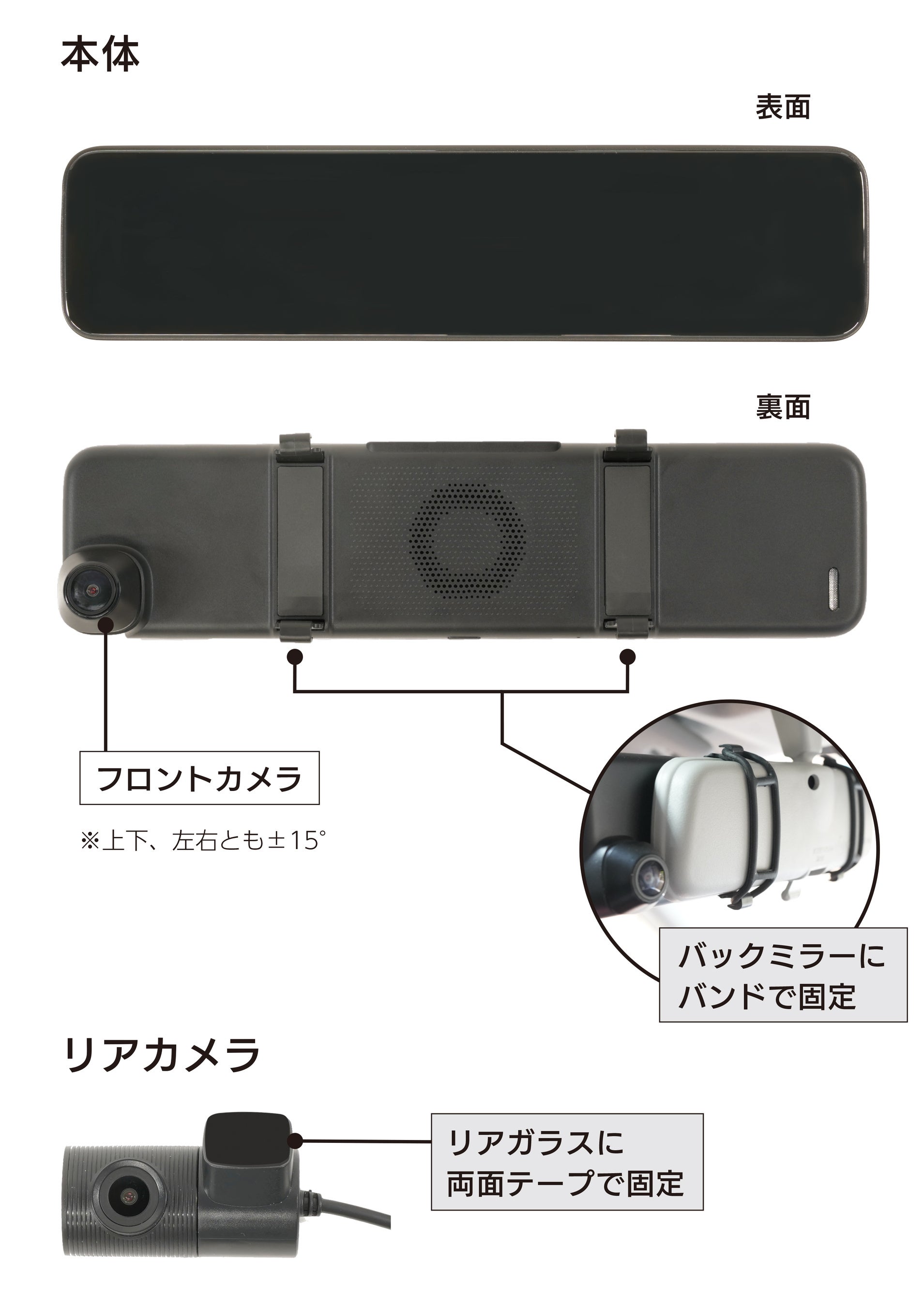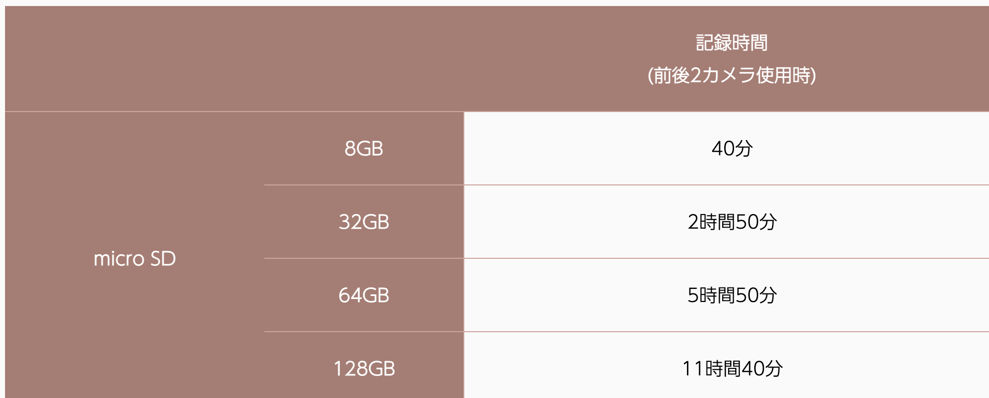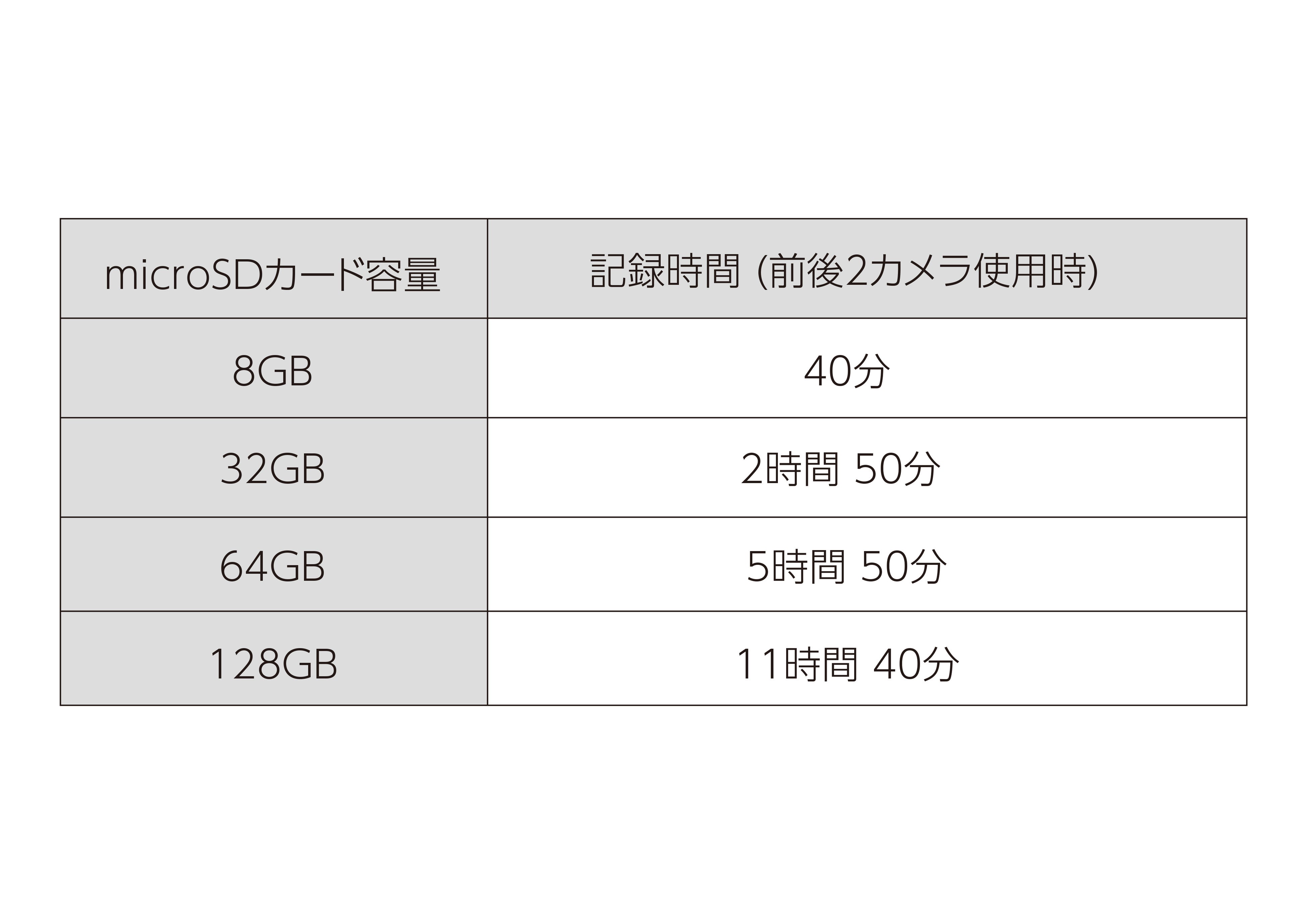 ※録画時間は目安となります。※カメラの解像度は前方カメラWQHD(2560×1440)、後方カメラ(1920×1080)に固定となります。