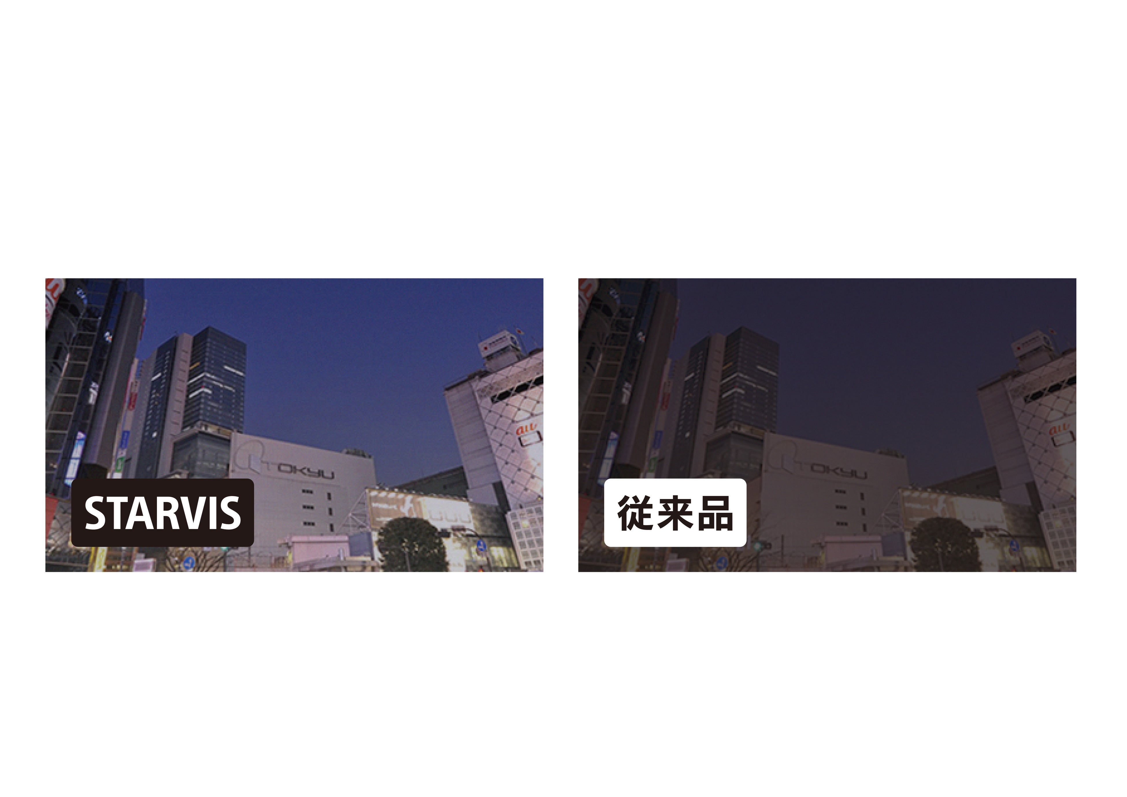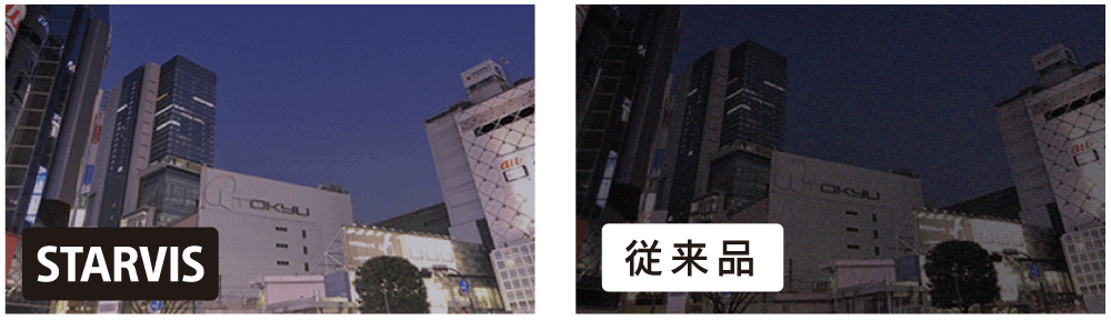 暗所撮影に強いソニー製STARVISセンサーを前後カメラに採用。夜でも低ノイズで鮮明な映像を撮影します。