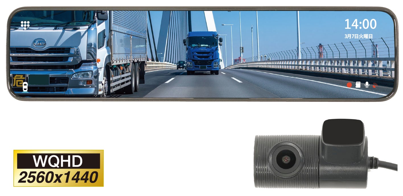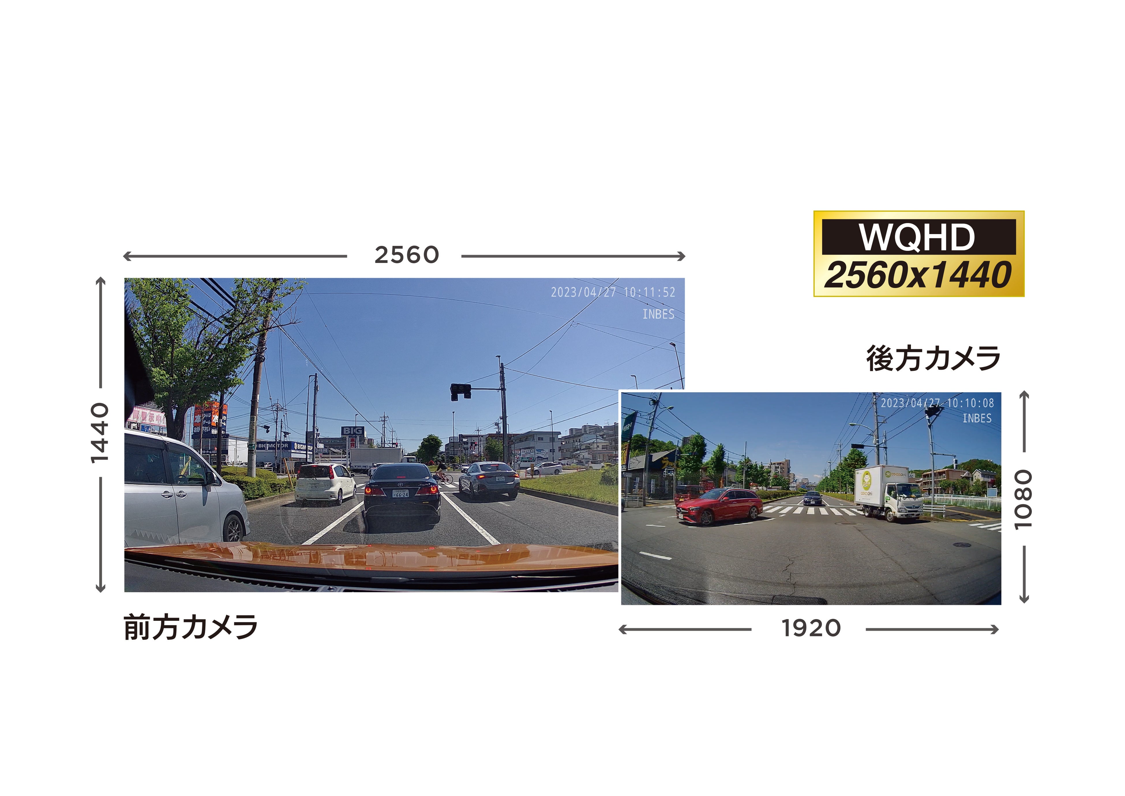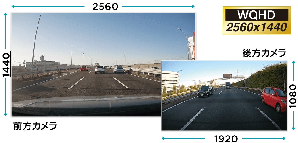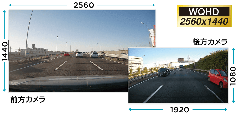 業界最高クラスのカメラ映像を前方WQHD(2560x1440)、後方Full-HD(1920x1080)で録画。走行中の映像を鮮明に記録します。