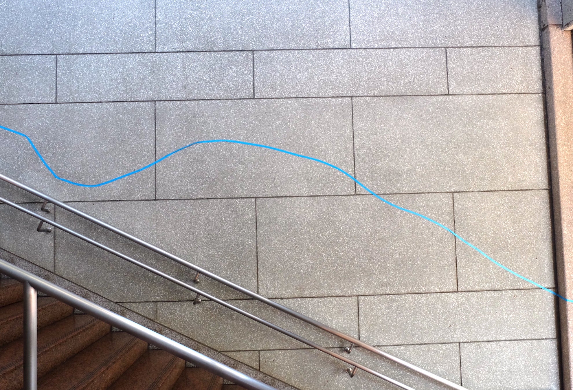 常磐線沿線で様々な線が生まれ、その線を手繰り寄せる様をモチーフに作られた今回のメインビジュアル。その線ができた背景や想いを共有できる場が今回の芸術祭だと思います。会場としては最南にある磯原駅での展示が、事務局の皆様の協力のもと完成しました。改札を出て、壁面にあるメインビジュアルから壁や天井をつなぐ青い線が休憩所の展示まで繋がっています。今芸術祭で大切なキーワード「線」を2次元から3次元へ、より現実的に感じ、線に導かれ、磯原駅の休憩所で展示をゆっくりとご覧いただき、そこから各会場に向かったり、帰りに振り返って見ていただいたり、ゆったりと常磐線舞台芸術祭をお楽しみいただければと思います。