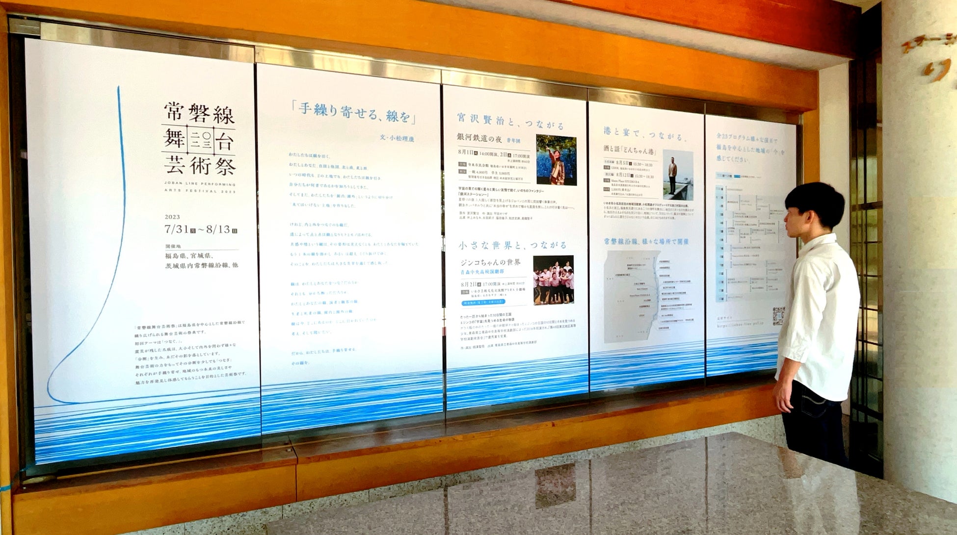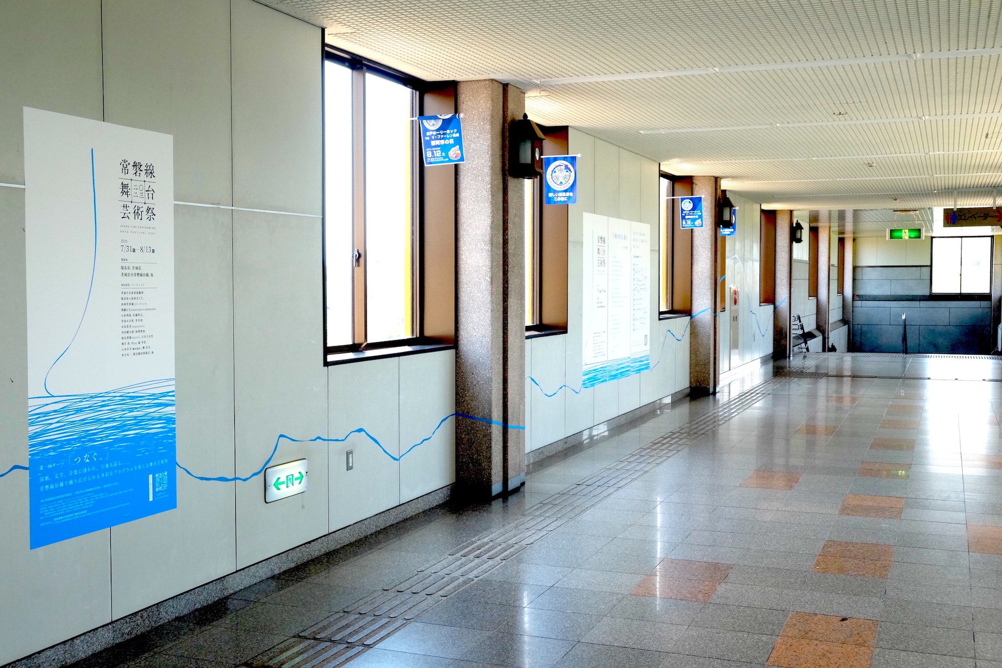 今年のテーマである「つなぐ、」と芸術祭ステイトメント「手繰り寄せる、線を」をモチーフに、デザイナー/アートディレクター形山佳之氏が手がけた常磐線舞台芸術祭のメインビジュアルを起点にした芸術祭の紹介とイメージ展示を、北茨城市JR磯原駅自由通路、待合所内で展開しています。『ここから「つなぐ、」』と題された本展示は、青く伸びた線を辿っていきながら常磐線舞台芸術祭の世界観を感じていただくものになっています。