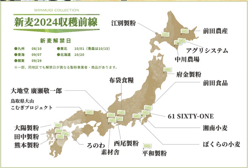 日本中の小麦産地(生産者・製粉会社)、流通業者、飲食店、消費者が連携して行う新麦コレクションのプロジェクト。小麦の収穫がもっとも早い九州が解禁日も早く8月10日。その後、東海、関東、東北、北海道と新麦前線は北上。日本のトップを