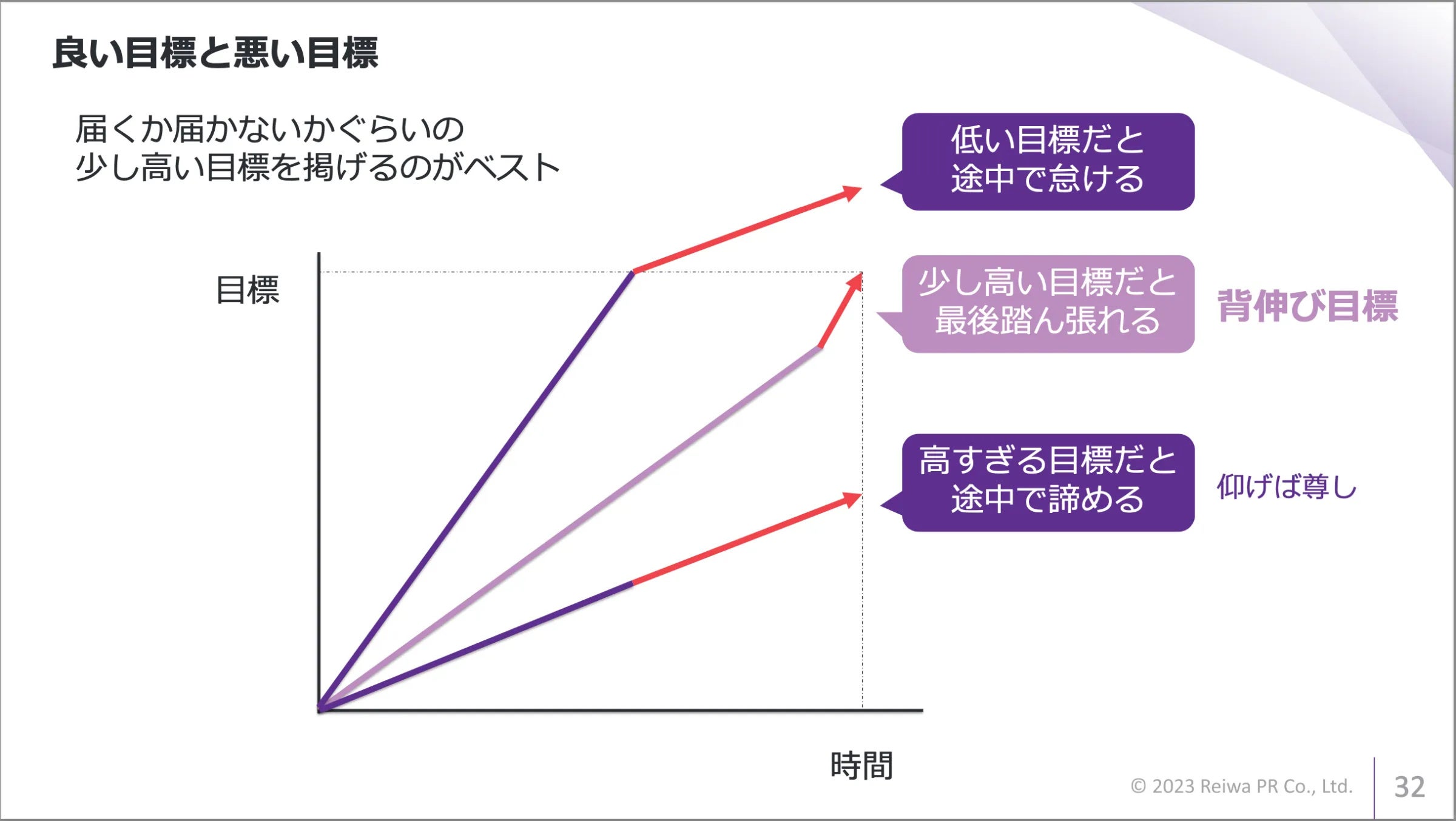 適切な目標設定とは、達成が困難だが可能性のある、少し高めの目標を立てることが最善です。また、目標は明確な達成基準を持ち、YesかNoで答えられる具体性が求められます。KPI(重要業績評価指標)はシンプルであるべきで、外部環境や他の要因に左右されることなく、自分たちの努力によって達成可能なものに設定することが重要です。