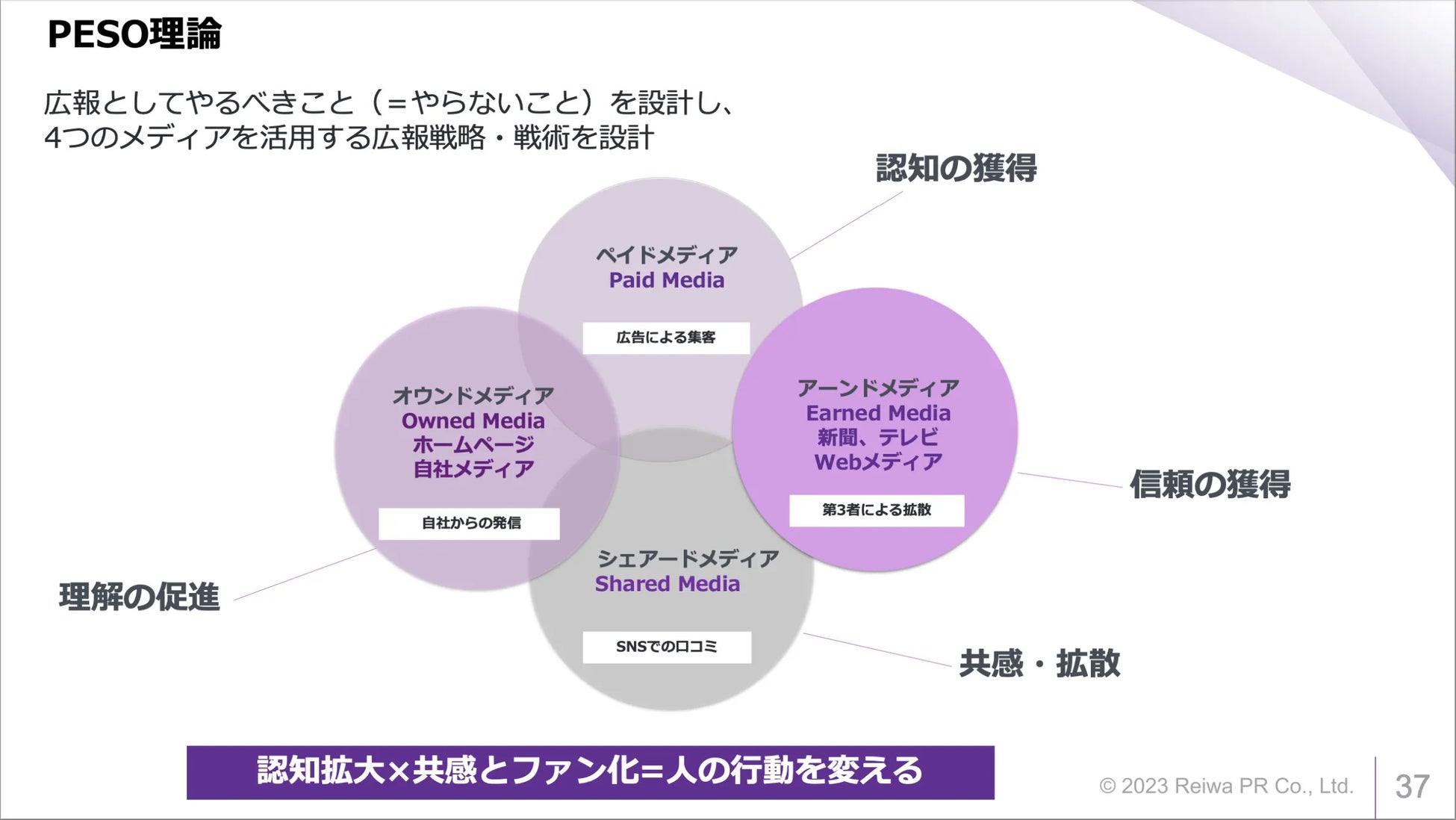 最後に、以下のPESOモデルを基にした戦術を考察しました。このフレームワークを活用し広報活動がどのように4のメディアタイプを組み合わせて効果的に展開できるかについて、具体的な戦術をグループで検討しました。