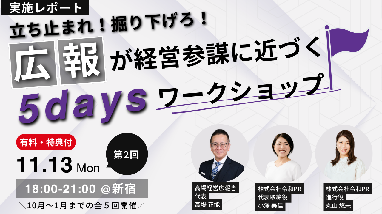 『立ち止まれ!掘り下げろ! 広報が経営参謀に近づく5Days ワークショップ』と題した有料ワークショップの第2回を、11月13日に開催いたしました。今回は当日のレポートをお伝えいたします。