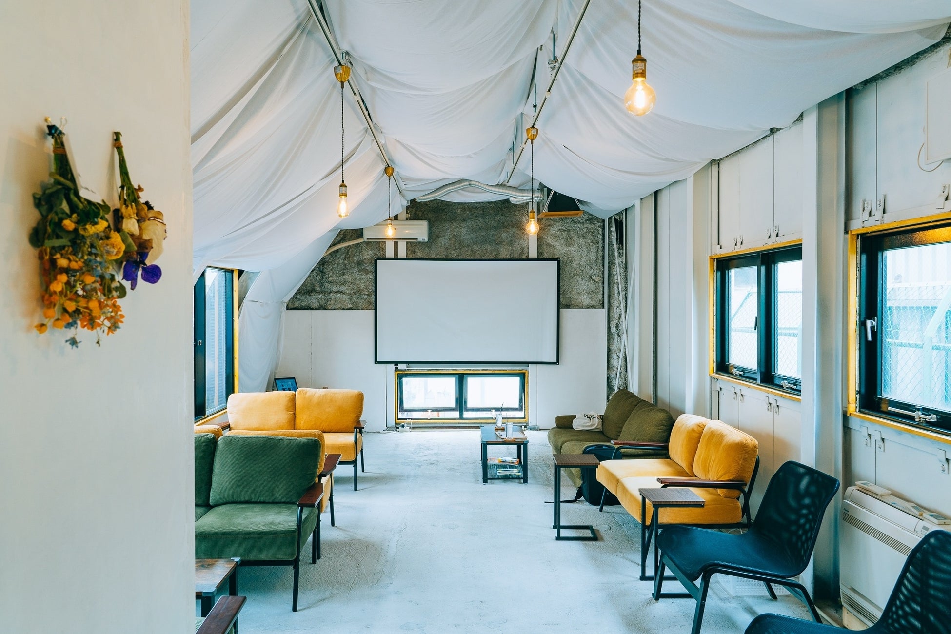 グランピング風の開放的な空間となっており、昼は日差しが差し込む明るい空間、夜は優しい照明が包み込んでくれるような落ち着いた空間になっております。