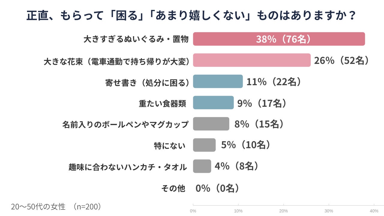 「大きすぎるぬいぐるみ・置物」が38%で最も多く、次いで「大きな花束」が26%となりました。