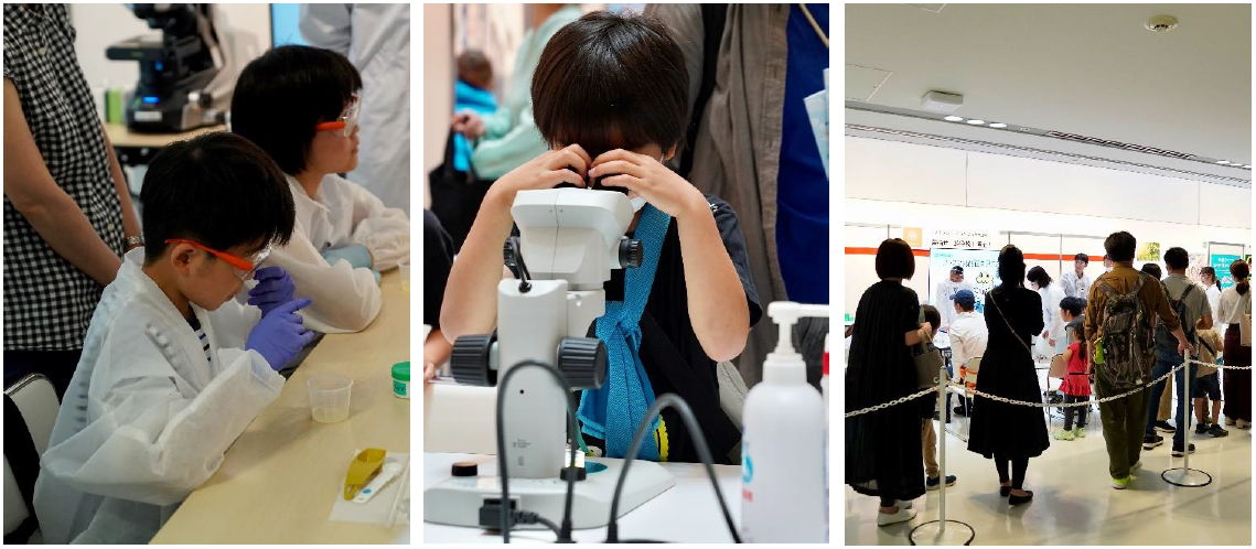 子どもたちは、白衣を着て観察をしたり、ゴーグルをつけてVRの世界を体験したりし、顕微鏡で昆虫や線虫、乳酸菌などを見て驚きの声を上げたり、塗り薬をつくる体験に真剣に取り組んだりする様子が見られました。また、小学生などから募集した生命に関する質問にアイパークのサイエンスメンターたちが答える「教えてサイエンスメンター!」では、「ゾンビって作れるの?」「どうしたら背が伸びるの?」などの質問に研究者たちが回答しました。
