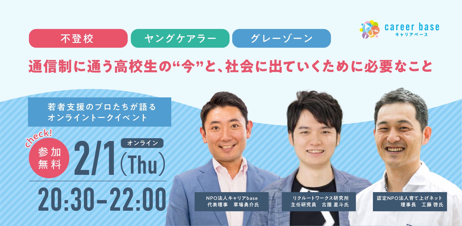 NPO法人キャリアbase(所在地:千葉県柏市/代表:草場勇介)は、通信制高校に通う高校生の“今”に目を向け、若者支援における今後の社会の在り方についてディスカッションしていく、オンライントークイベントを開催します。今回は、認定NPO法人育て上げネット 理事長の工藤 啓氏、リクルートワークス研究所主任研究員 古屋 星斗氏をゲストスピーカーとしてお招きします。