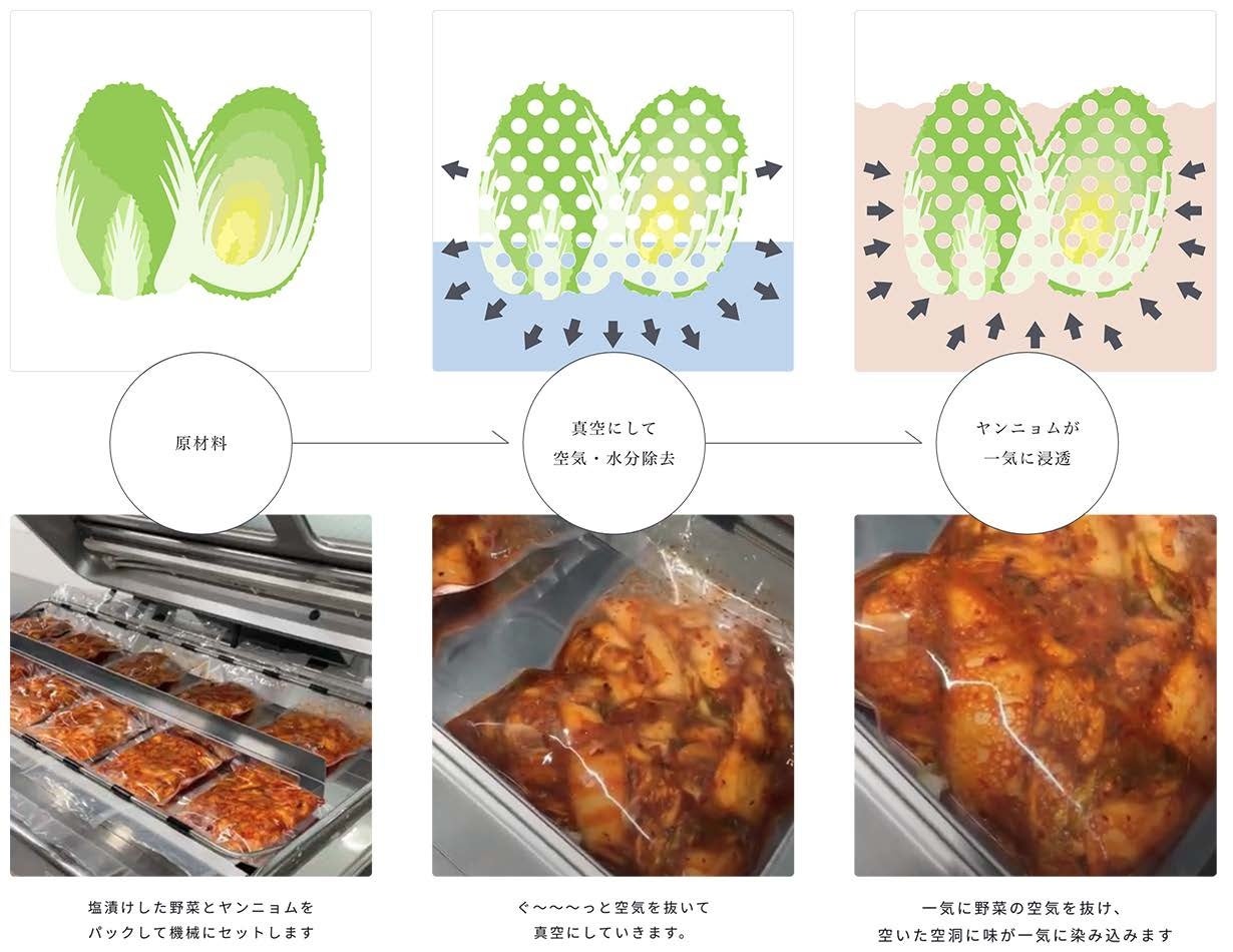 キムチの原材料を真空状態にすることによって、原材料の細胞から空気や水分が取り除き、八恵堂秘伝のヤンニョム(つけダレ)を浸透させます。