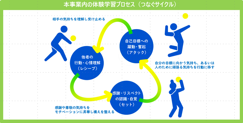 学習プロセス:バレーボール競技における一連の動作を取り入れた「つなぐサイクル」によって、相手の気持ちを受け止め、人に感謝する気持ちを未来へのステップにつながる自らの行動に変換していく一連の循環を体験学習します。