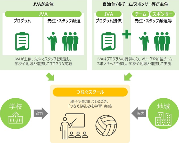 「つなぐスクール」は、JVAが主催するほか、自治体や各種スポーツチーム等の皆さまが単独で実施することが可能となっています。