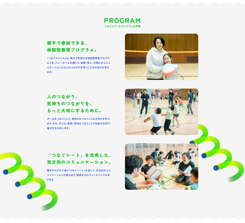 「つなぐ」スポーツであるバレーボールを通して、身近な親子の間にコミュニケーションと心の対話の大切さについての気づきを提供し、さらには家族以外の人とも協力して実践することで、協調性や思いやりの気持ちを引き出しながらその有効性について自然に意識が芽生える仕組みになっています。