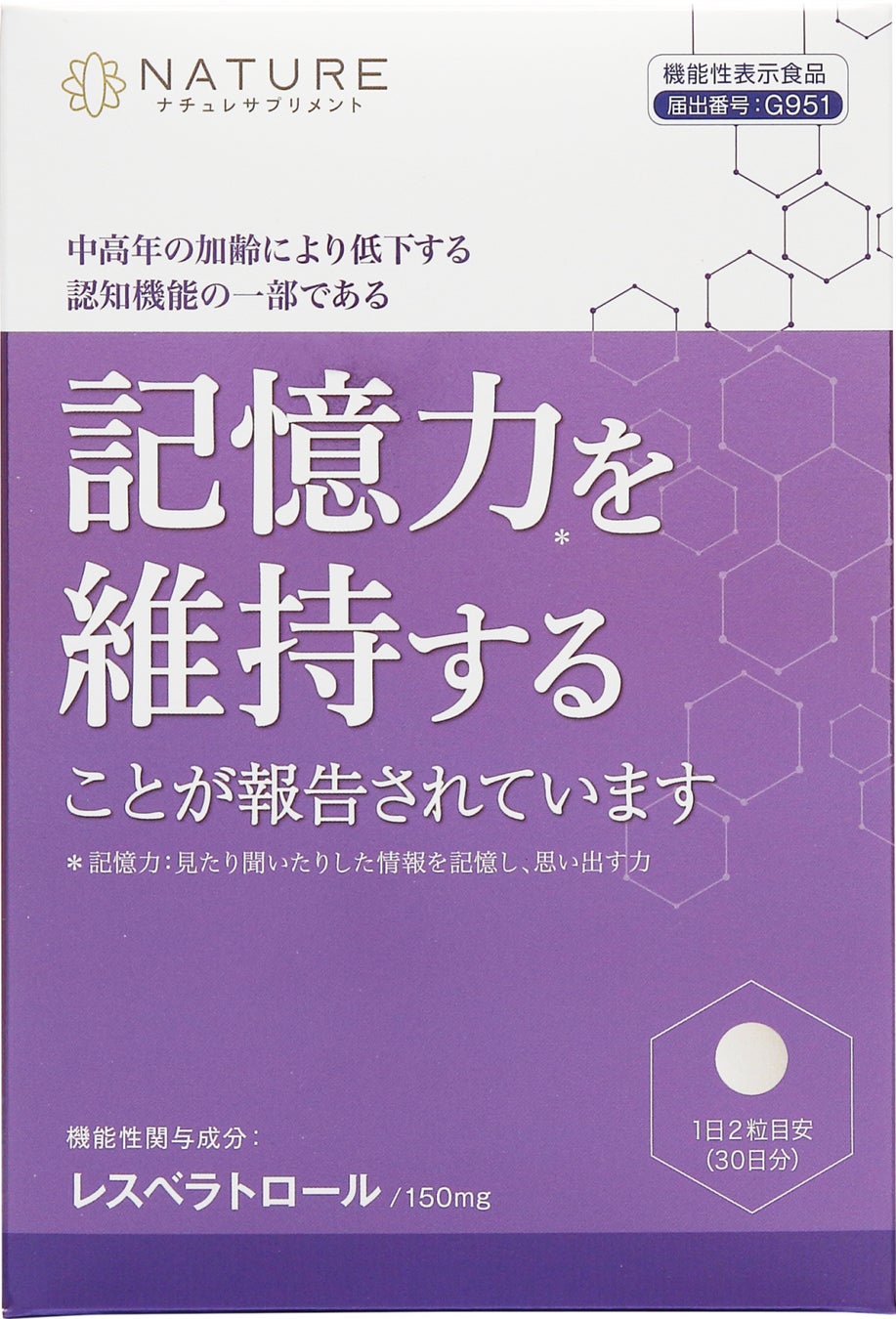 本品にはレスベラトロールが含まれます。レスベラトロールは、中高年の加齢により低下する認知機能の一部である記憶力*を維持することが報告されています。