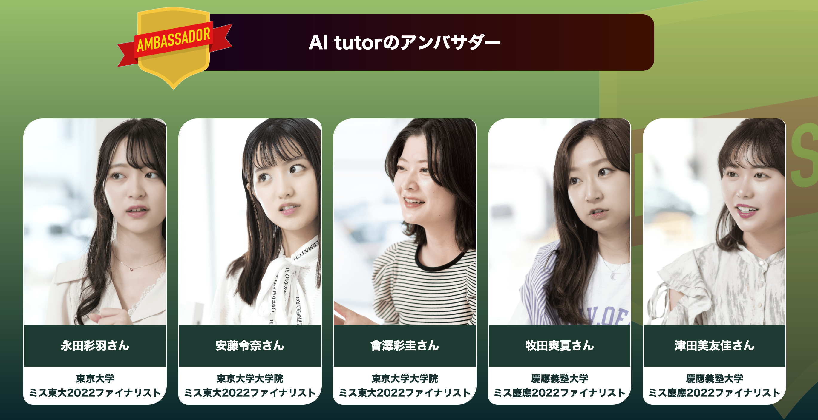 ミス東大2022およびミス慶應2022のファイナリスト5名が、次世代家庭学習・家庭教師アプリ「AI tutor」のアンバサダーに就任