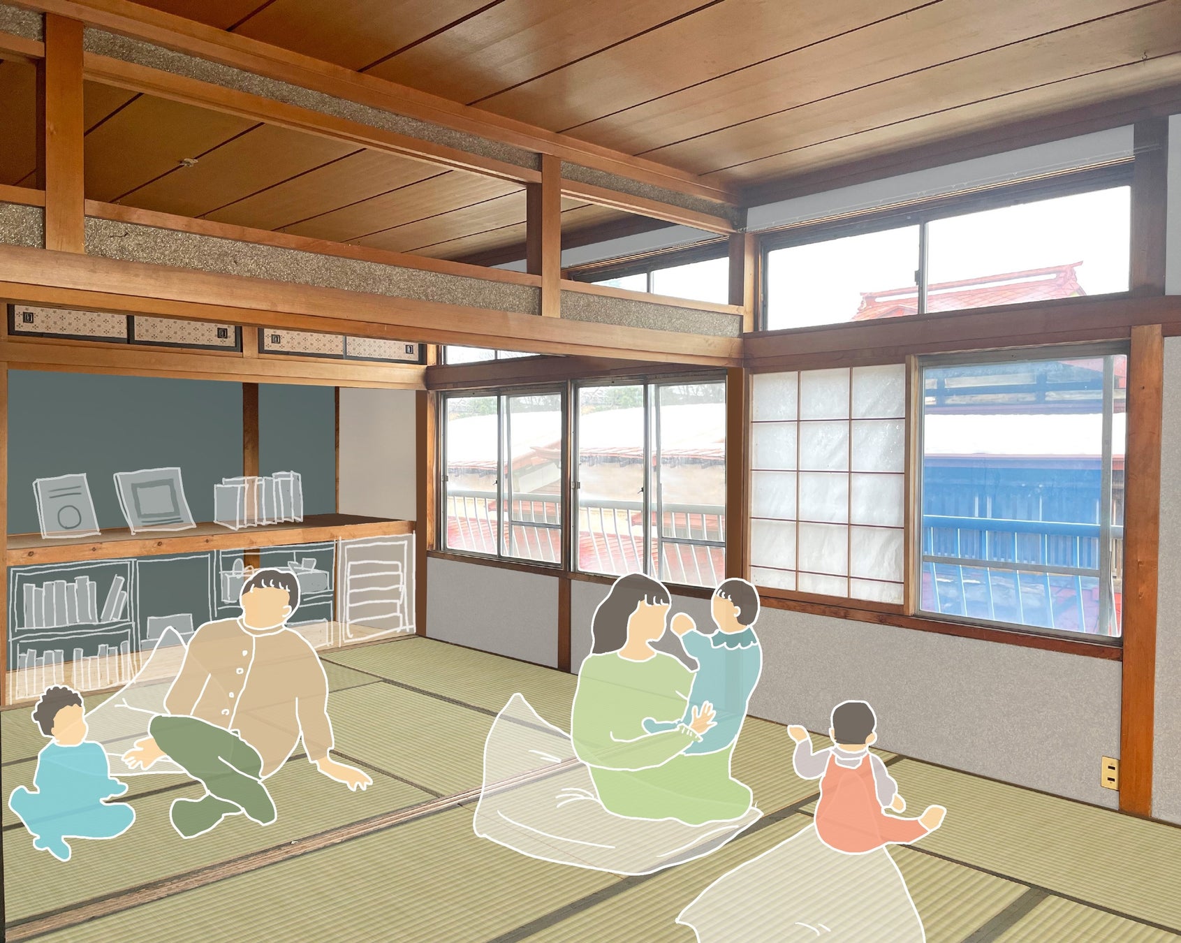 2階のフリースペースは、まちのリビングとして世代に関わらず誰もが、ふらっと立ち寄って安心して利用できるように整備していきたいと思っています。そして、地域の子どもを地域の大人で皆んなで育てるようなコミュニティを作っていきたいと考えます。例えば、自分の家で使わなくなった「おむつ」や「おもちゃ」を持ち寄ってシェアしたり、子育ての情報交換や交流が生まれたり。ちょっと作りすぎたご飯を持ち寄って皆んなでシェアしたり。絵本やソファを置いて寝転がって使えるような畳のスペースとします。