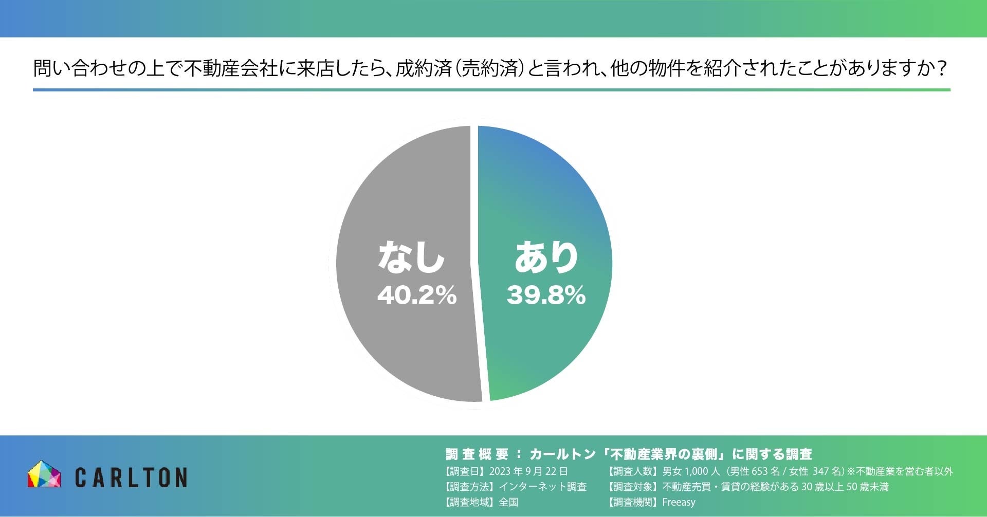 「問い合わせの上で不動産会社に来店したら、成約済(売約済)と言われ、他の物件を紹介されたことがありますか?」と質問したところ、約4割(39.8%)の方が『ある』と回答しました。