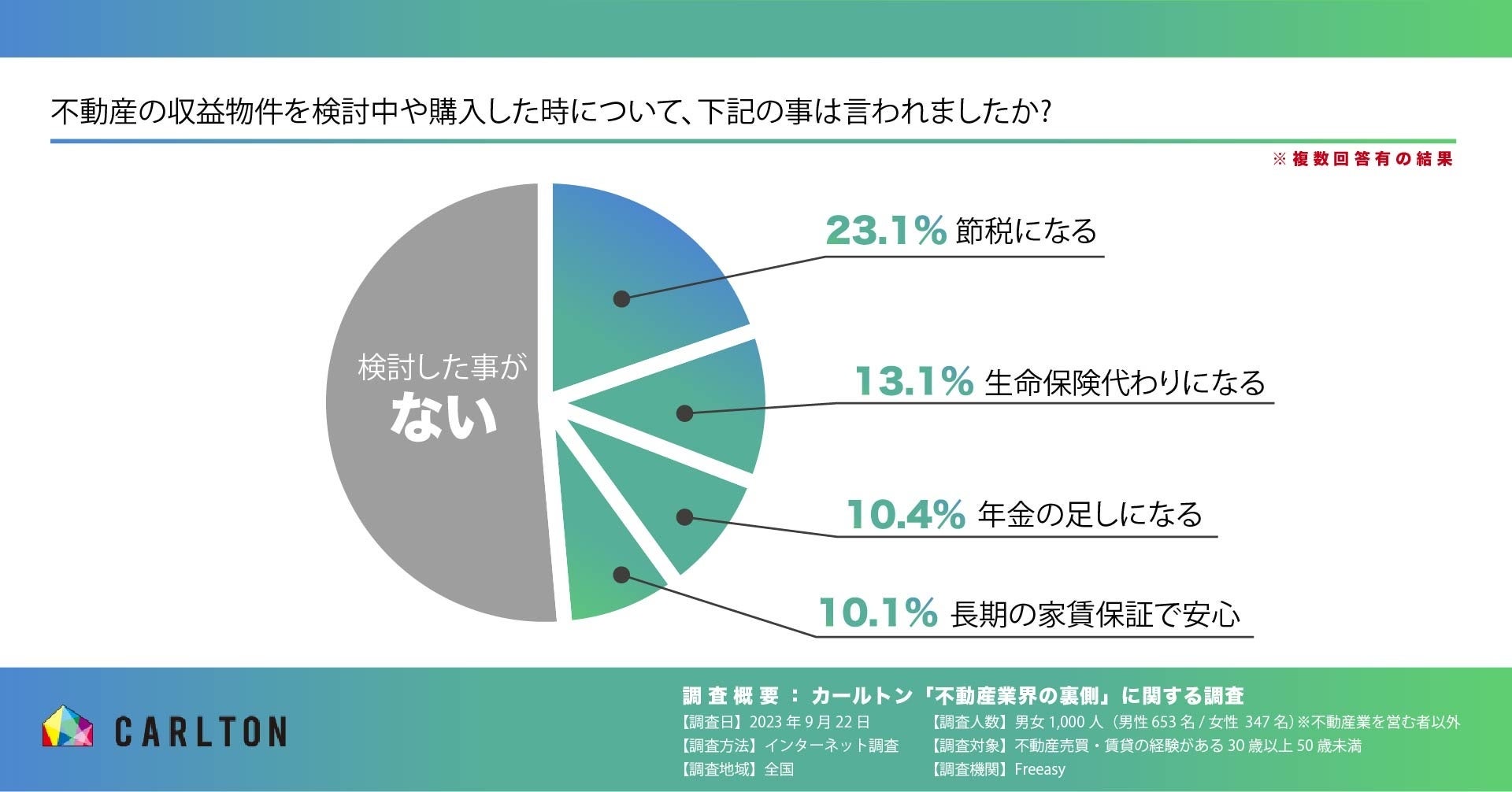 「不動産の収益物件を検討中や購入した時について、下記の事は言われましたか?」と質問したところ、『節税になる(23.1%)』、『生命保険代わりになる(13.1%)』、『年金の足しになる(10.4%)』、『長期の家賃保証で安心(10.1%)』と回答しました。