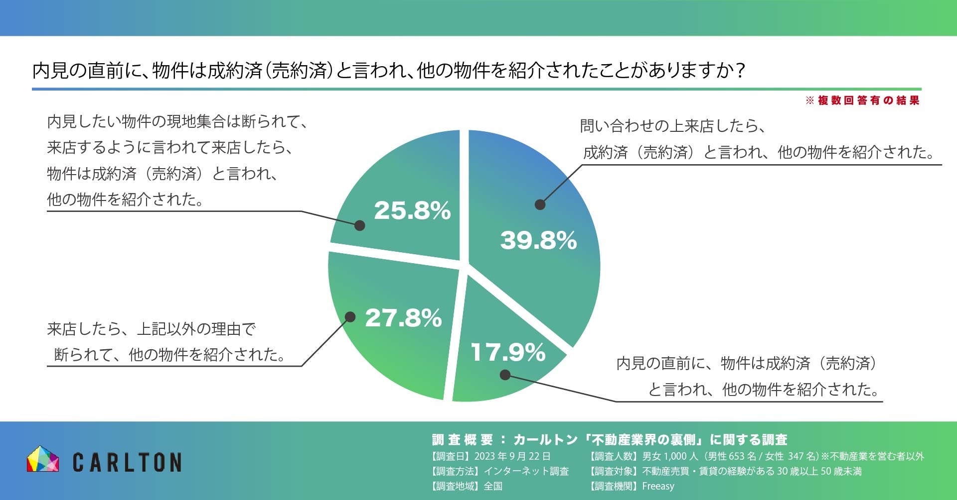 問い合わせや内見希望をだしても、検索サイトに掲載されている物件だったのに他物件の紹介をされる経験をした方が多いことがわかりました。不動産会社の悪意がない掲載ミスの場合もありますが、実際は存在しない条件が良い物件を掲載し、来店に呼び込む手法で行っている不動産会社も存在しております。