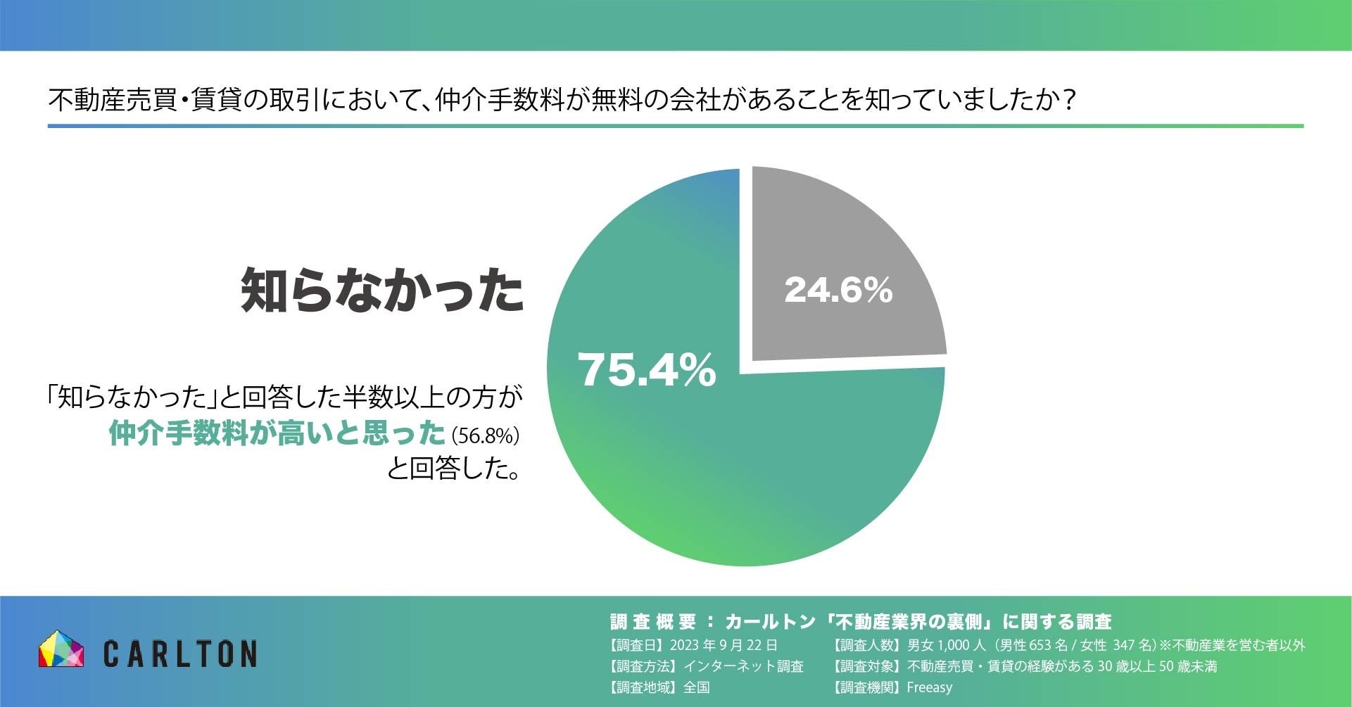「不動産売買・賃貸の取引において、仲介手数料が無料の会社があることを知っていましたか?」と質問したところ、『知っている(24.6%)』・『知らなかった(75.4%)』回答しました。